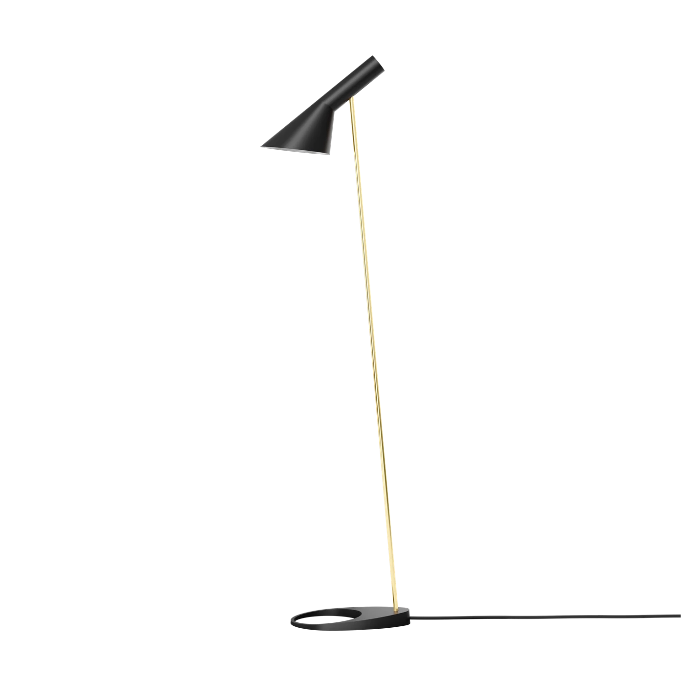 Lámpara de pie AJ de Louis Poulsen en Brass/Black. Diseño de Arne Jacobsen con pantalla orientable, luz dirigida y estructura en acero, cinc y latón.