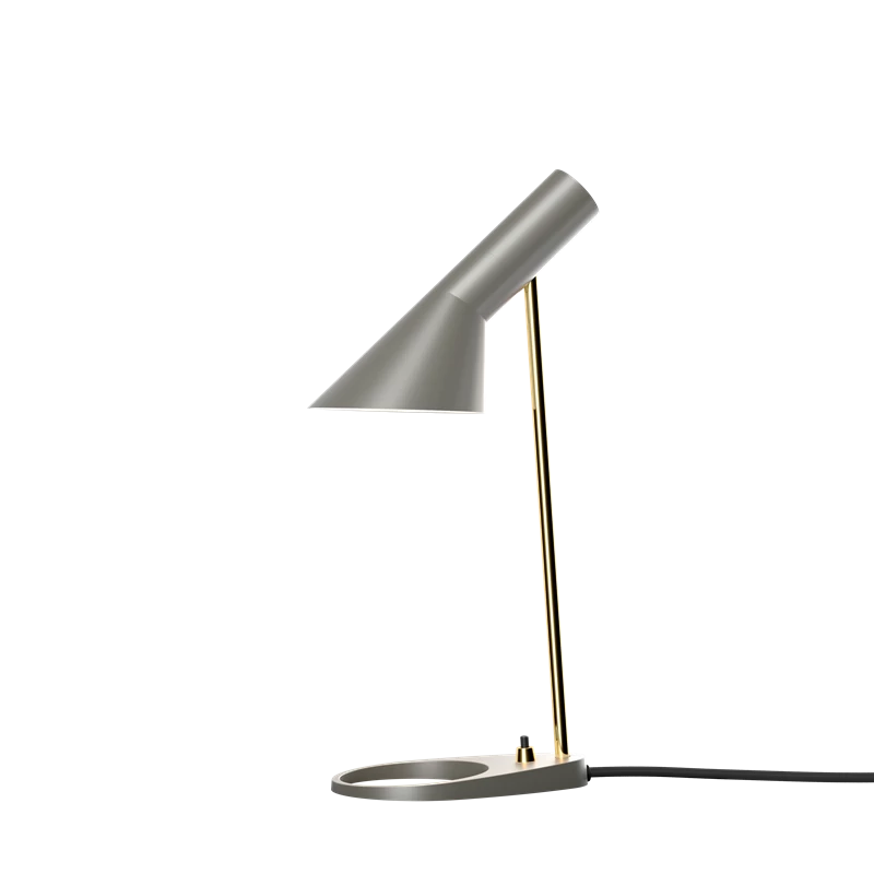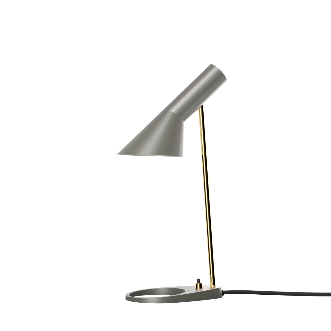 Lámpara de sobremesa AJ Mini de Louis Poulsen en Warm Grey. Diseño de Arne Jacobsen con pantalla orientable, luz dirigida y estructura en acero, cinc y latón.