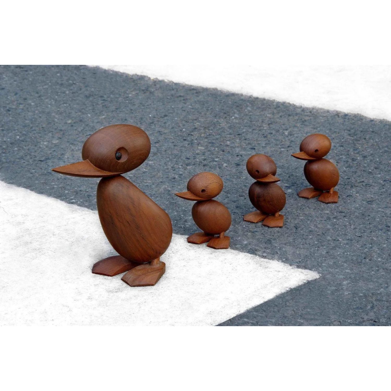 Tallado a mano en madera de teca maciza, cada pato presenta una silueta depurada y un cabezal móvil, que permite múltiples expresiones y da vida a la pieza. Junto al modelo Duckling (8,7 cm), permite crear composiciones que evocan la calidez de la familia y la tradición danesa.