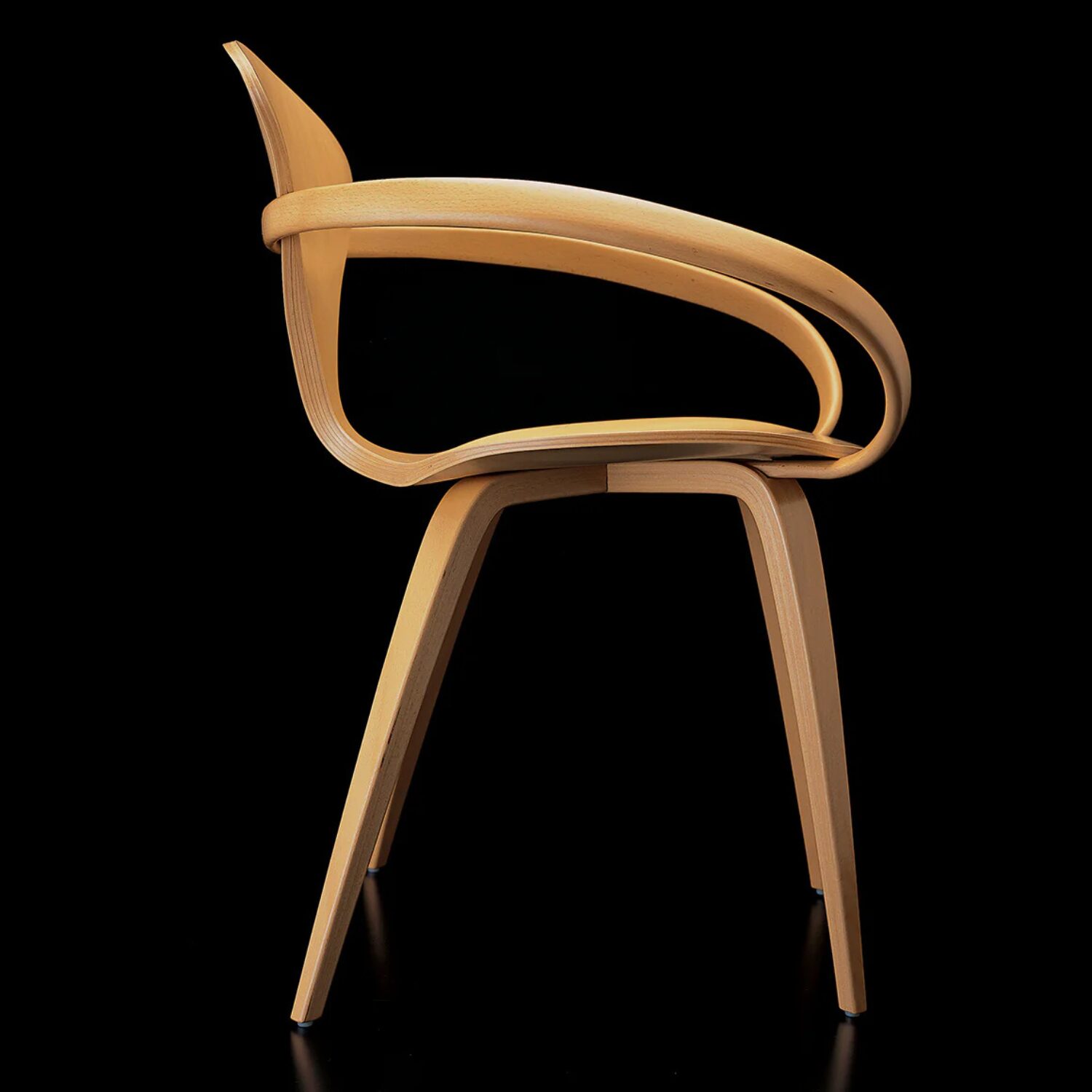 Norman Cherner desarrolló esta silla a partir de una investigación avanzada sobre la madera contrachapada moldeada, explorando cómo una misma pieza podía resolver estructura, ergonomía y expresión formal.