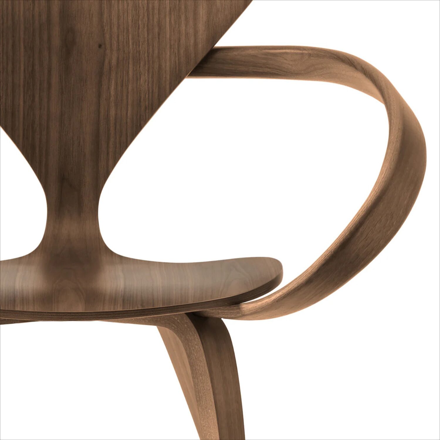 Silla con brazos en madera moldeada con acabado en nogal Natural Walnut, con reposabrazos continuo en una sola pieza integrado en la estructura.