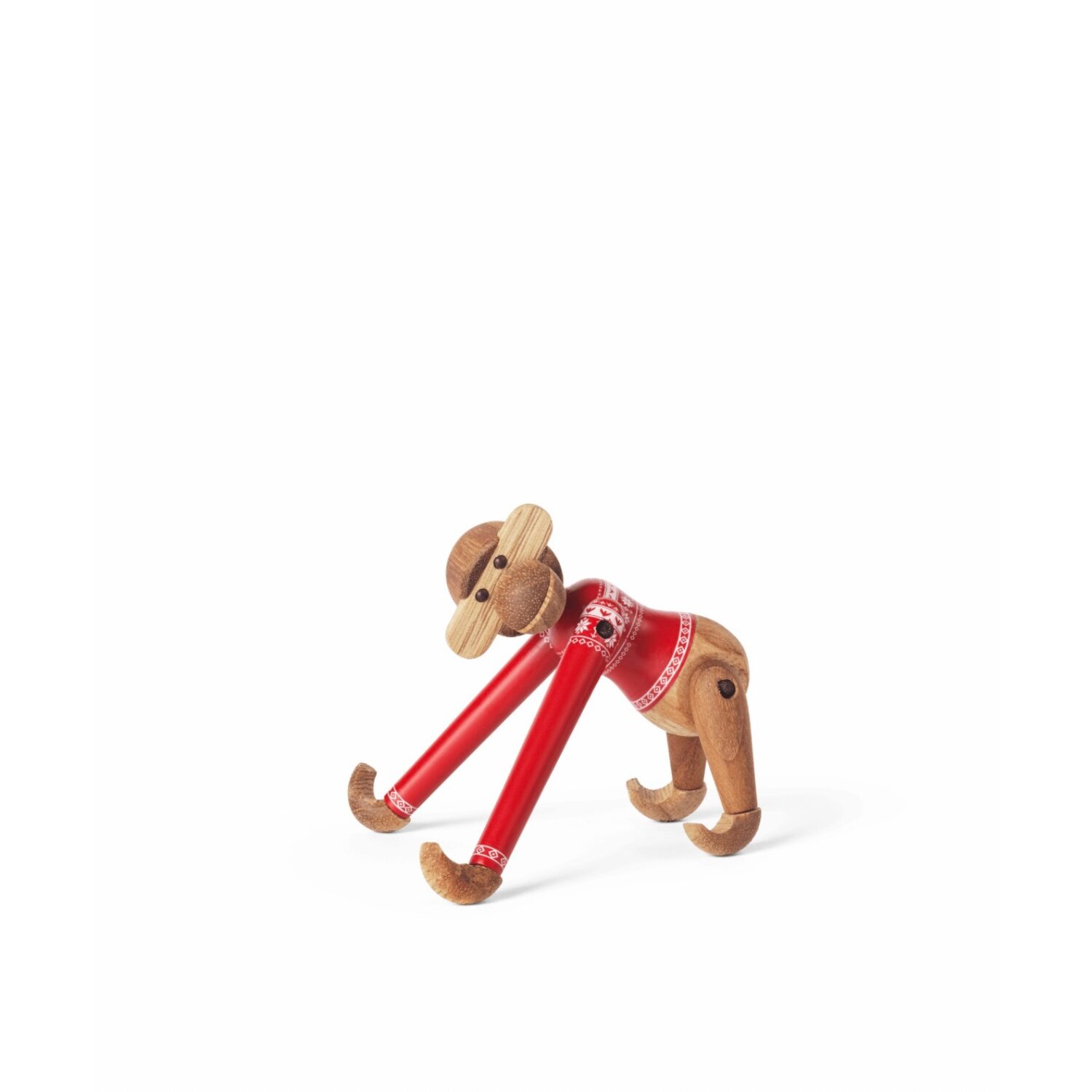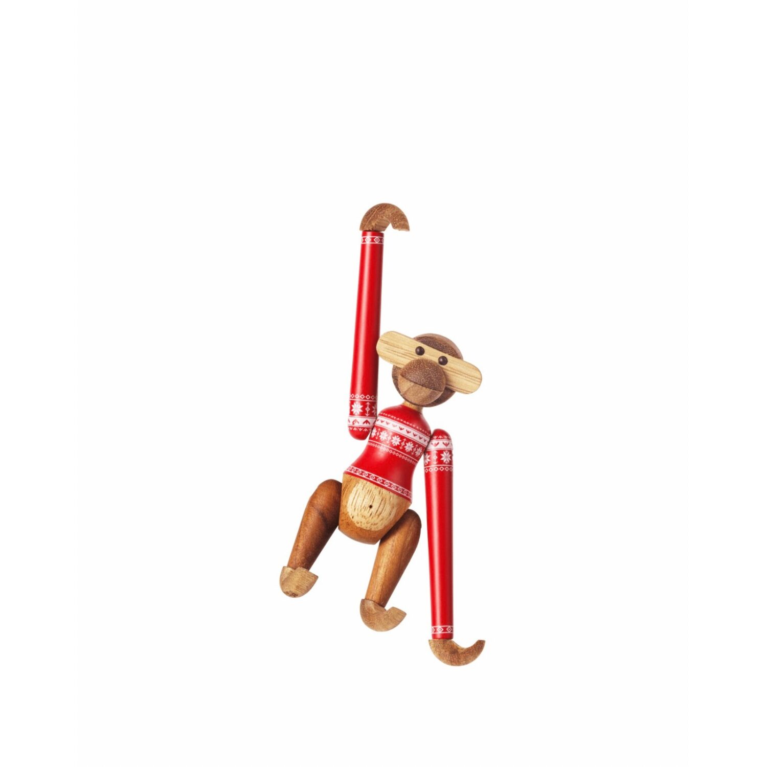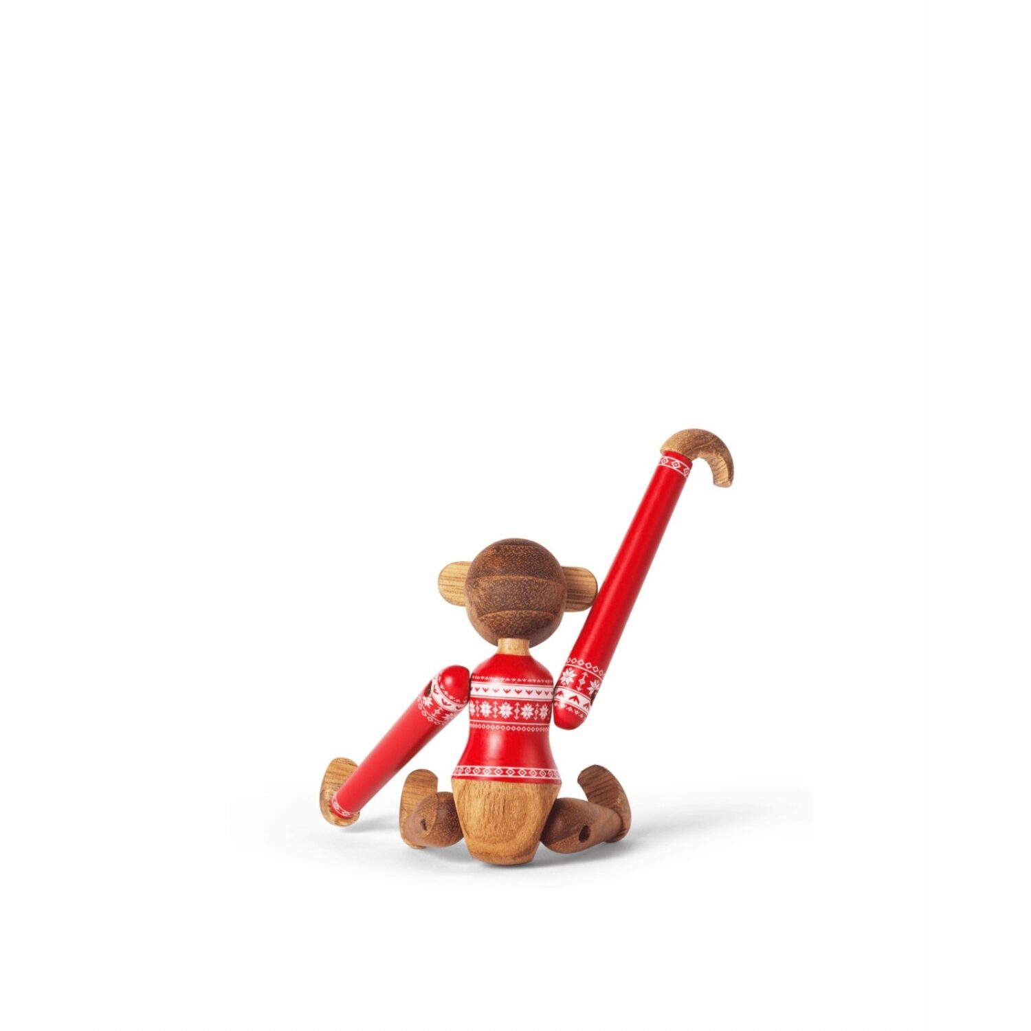 Christmas Jumper Monkey Mini de Kay Bojesen Denmark. Figura navideña de 9,5 cm elaborada en teca y limba certificadas FSC®, con jersey rojo pintado a mano.