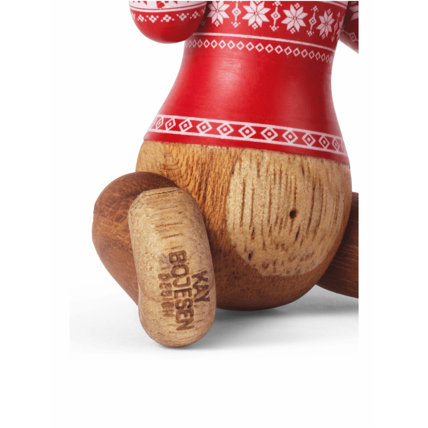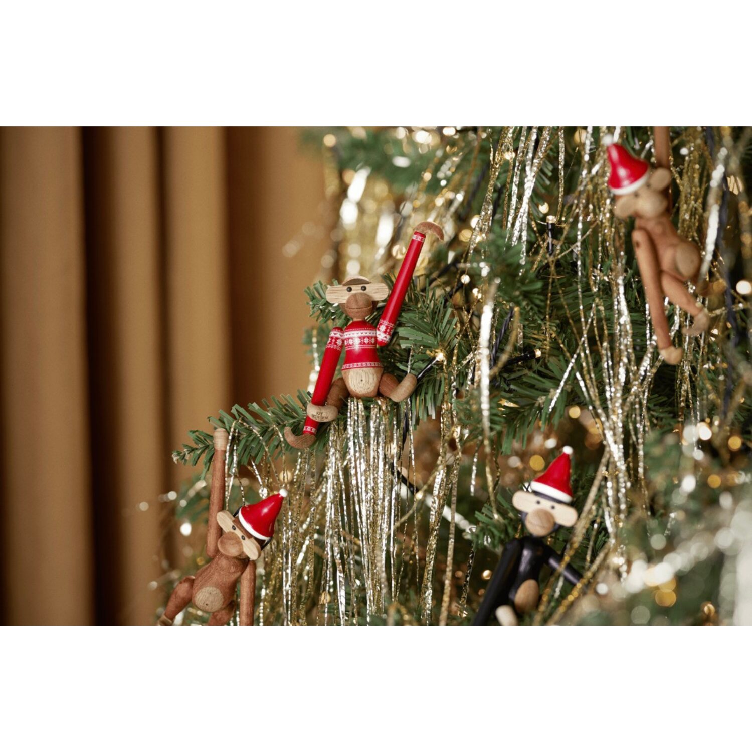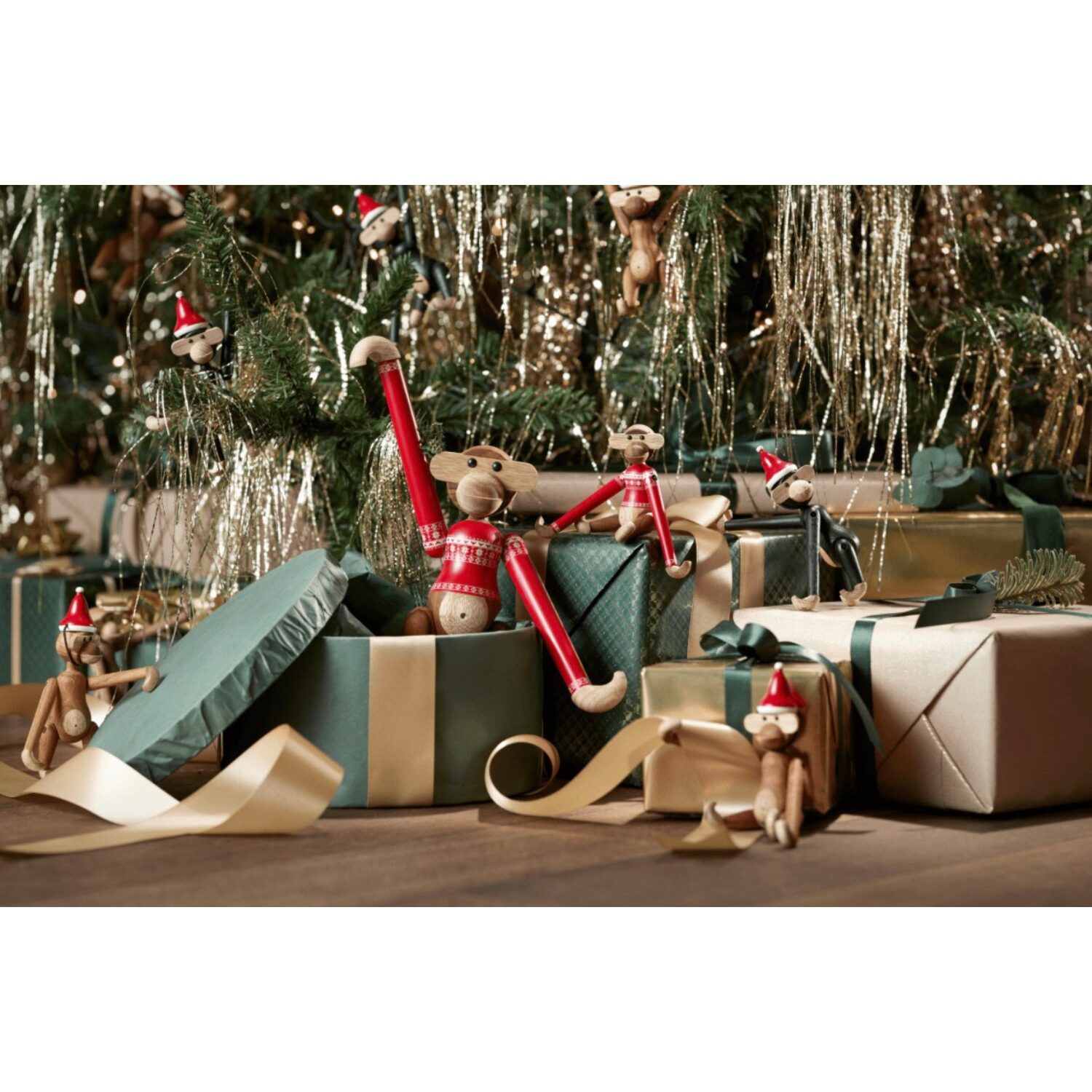 Christmas Jumper Monkey Mini de Kay Bojesen Denmark. Figura navideña de 9,5 cm elaborada en teca y limba certificadas FSC®, con jersey rojo pintado a mano.