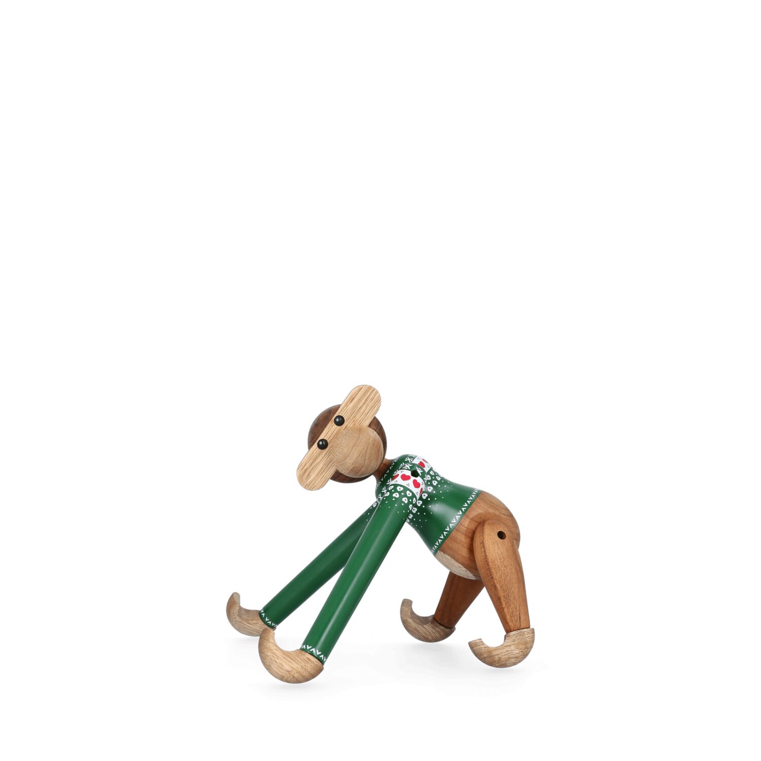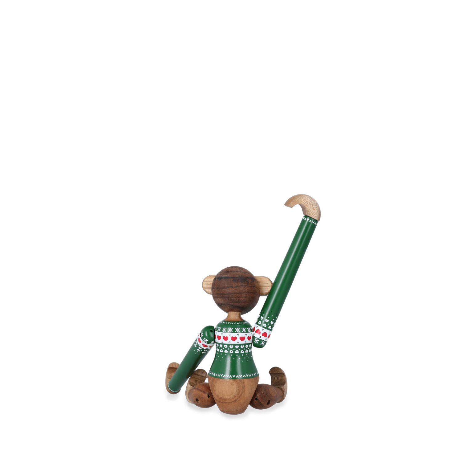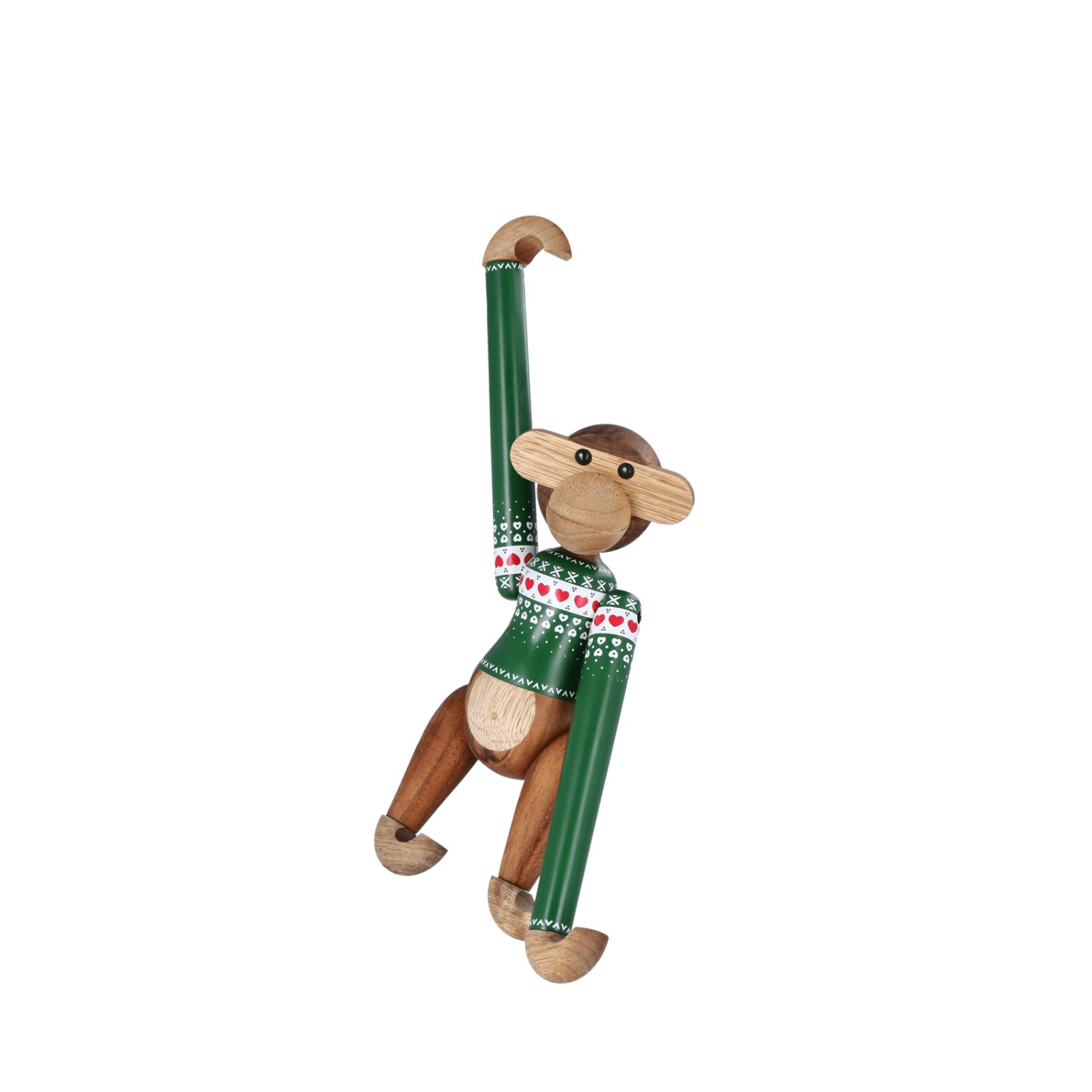 Christmas Jumper Monkey 2025 Small de Kay Bojesen Denmark. Figura de teca y limba aceitada con certificación FSC®, vestida con un suéter verde de inspiración navideña.
