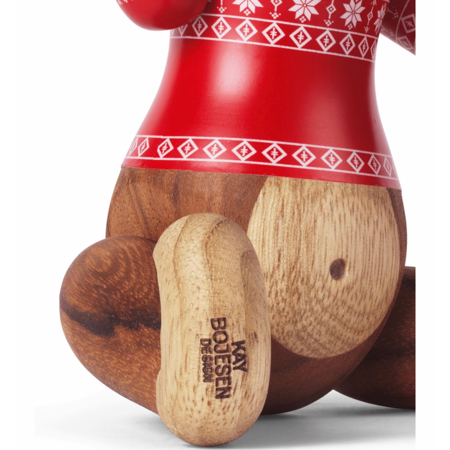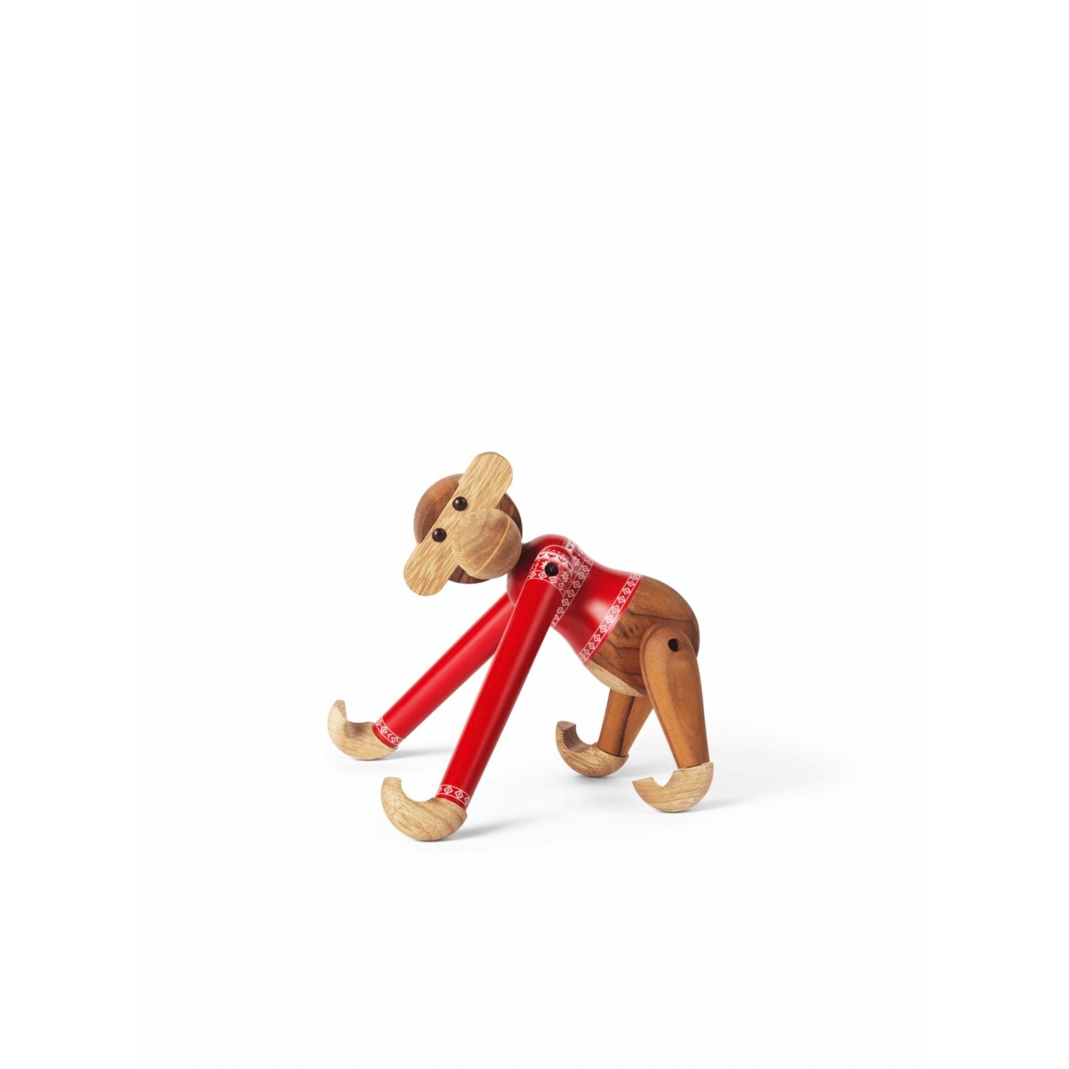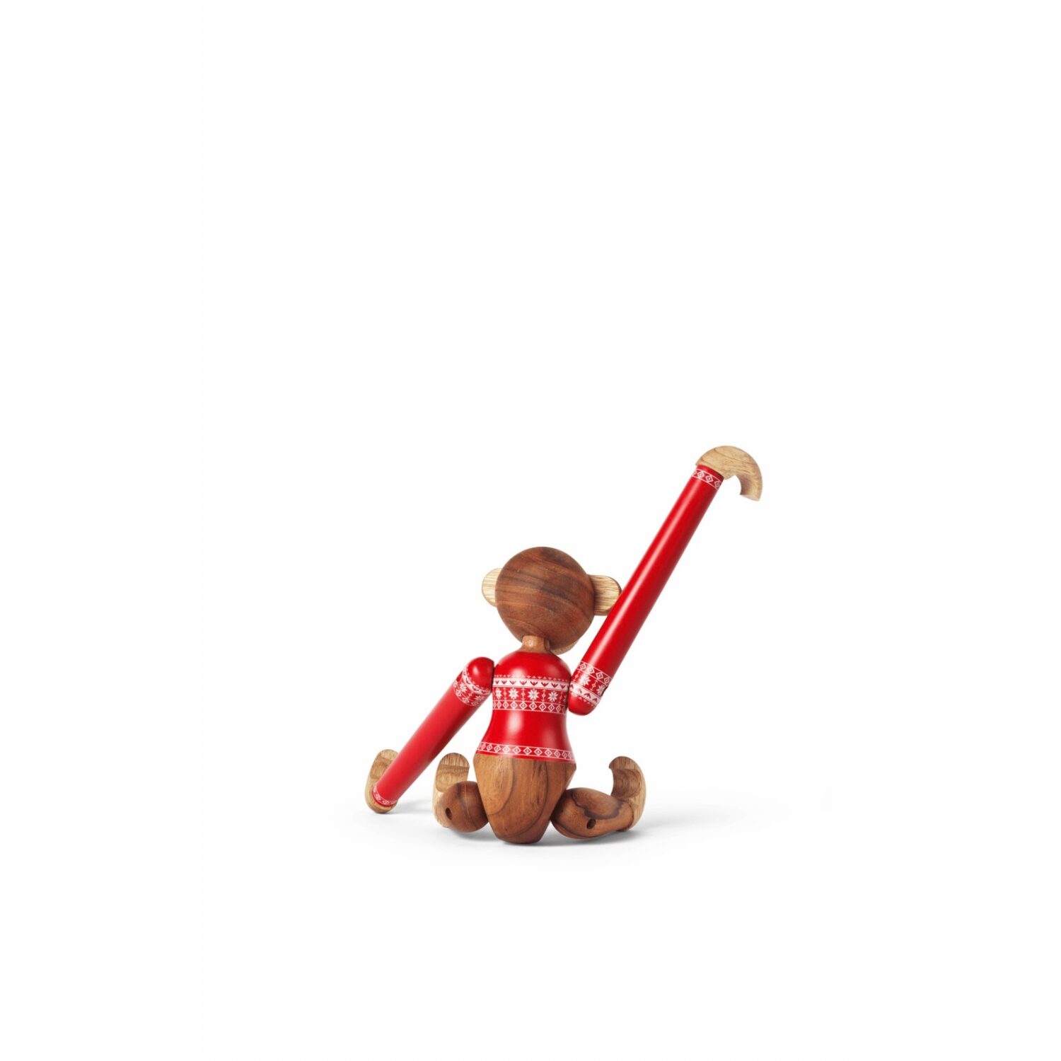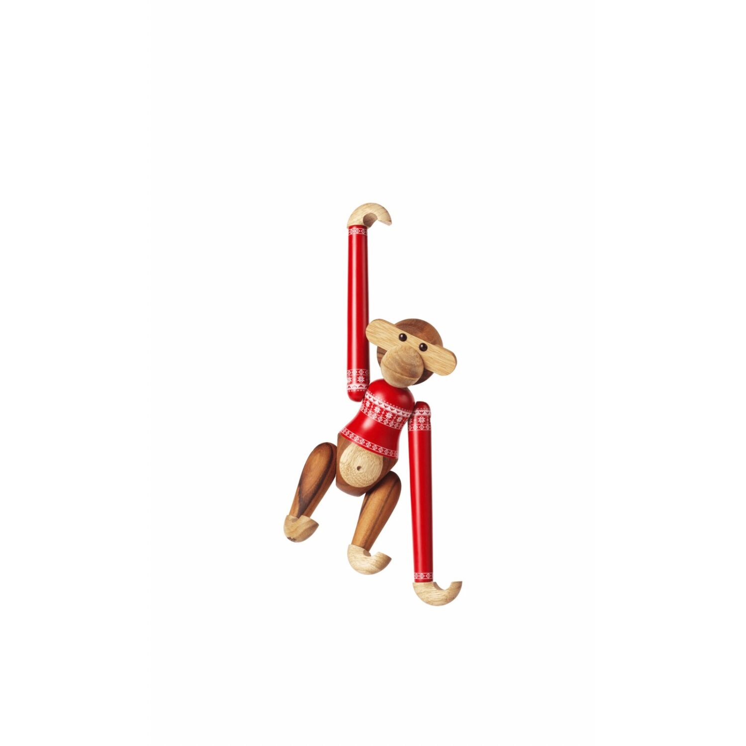Christmas Jumper Monkey Small de Kay Bojesen Denmark. Figura navideña de 18,5 cm elaborada en teca y limba certificadas FSC®, con jersey rojo pintado a mano.