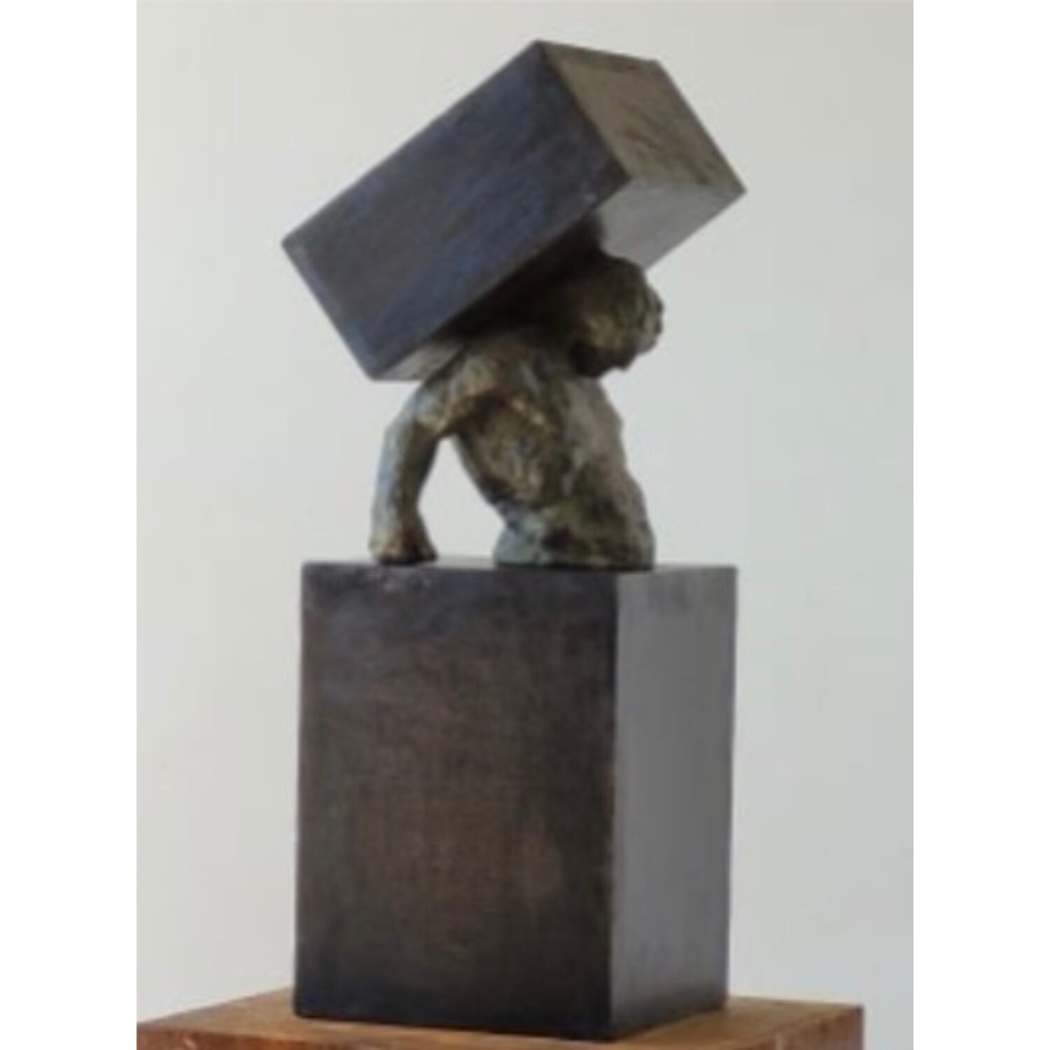 La figura humana, inclinada bajo el peso de un bloque metálico, se eleva desde un pedestal que sugiere tanto carga como resistencia. La materia, modelada con gesto manual y energía contenida, se transforma en metáfora de la existencia: el esfuerzo, la memoria y la perseverancia.