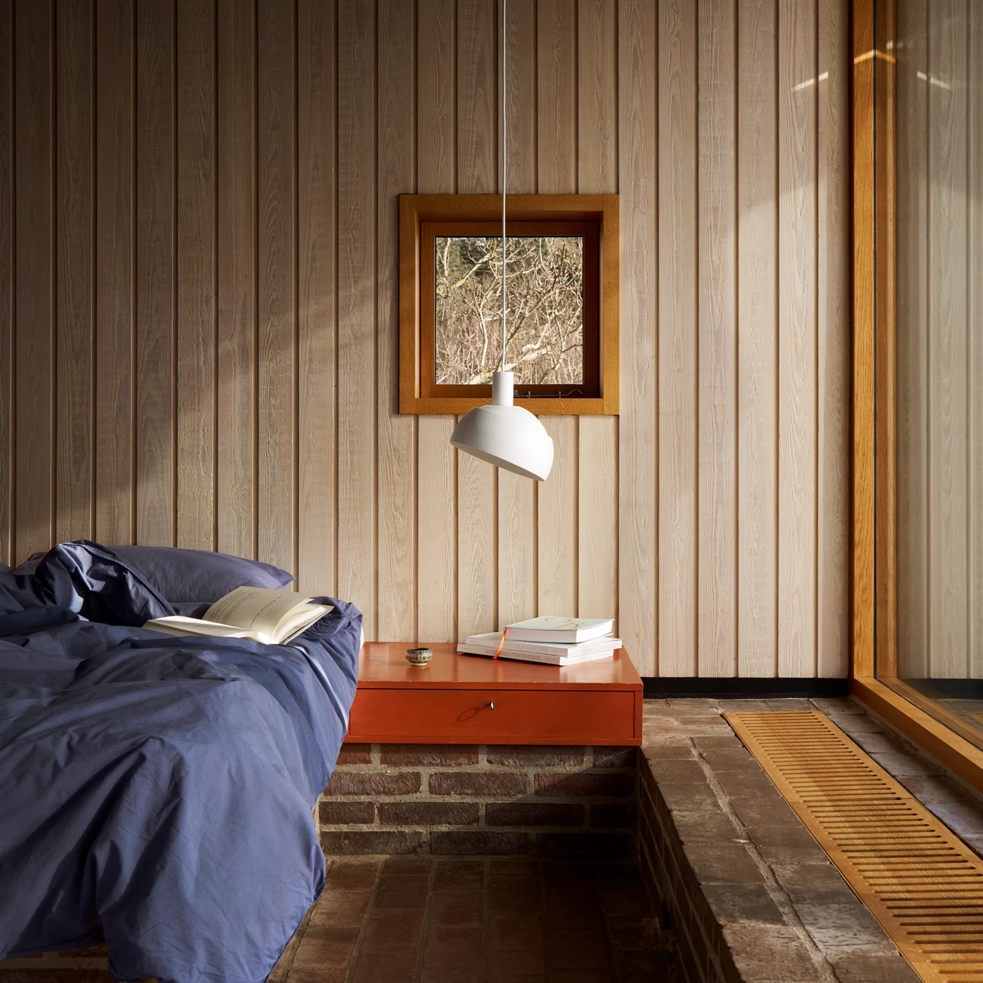 Inspirada en los bocetos de Juhl, la lámpara está formada por dos pantallas superpuestas que generan un juego geométrico y funcional. La pantalla superior se sitúa sobre la inferior, permitiendo controlar la dirección de la luz de distintas formas y aportando dinamismo al diseño.