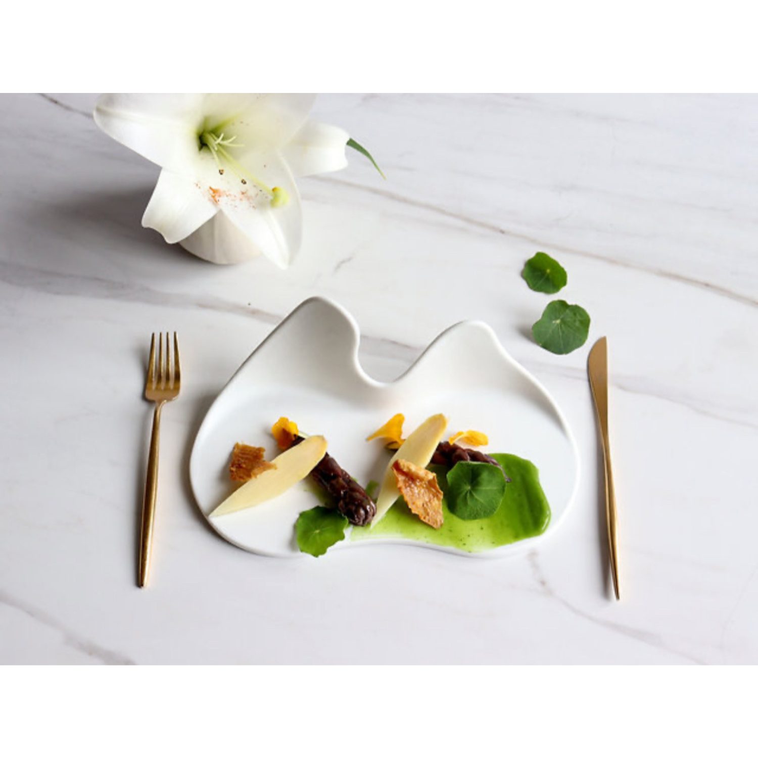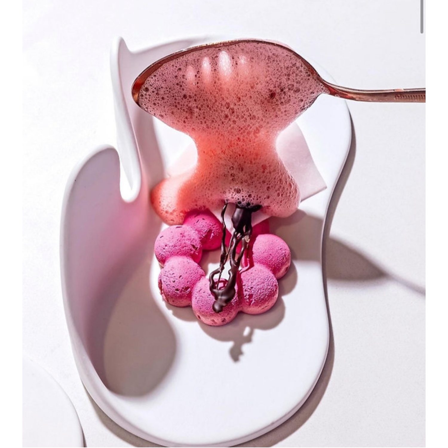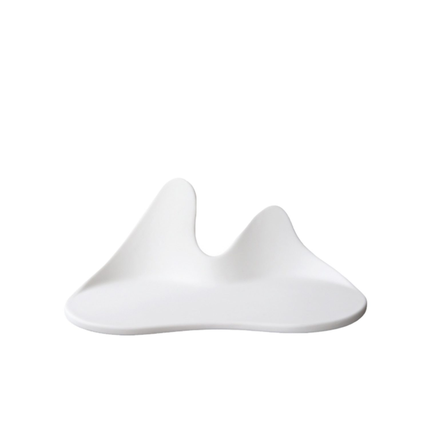 Fabricado en porcelana biscuit mate, cocida a 1.300 °C, combina resistencia, densidad y un tacto sensual que lo convierte en un objeto tanto funcional como estético. Su diseño minimalista y expresivo ofrece infinitas posibilidades de uso, desde tapas o postres hasta emplatados creativos en la alta gastronomía o en el hogar.