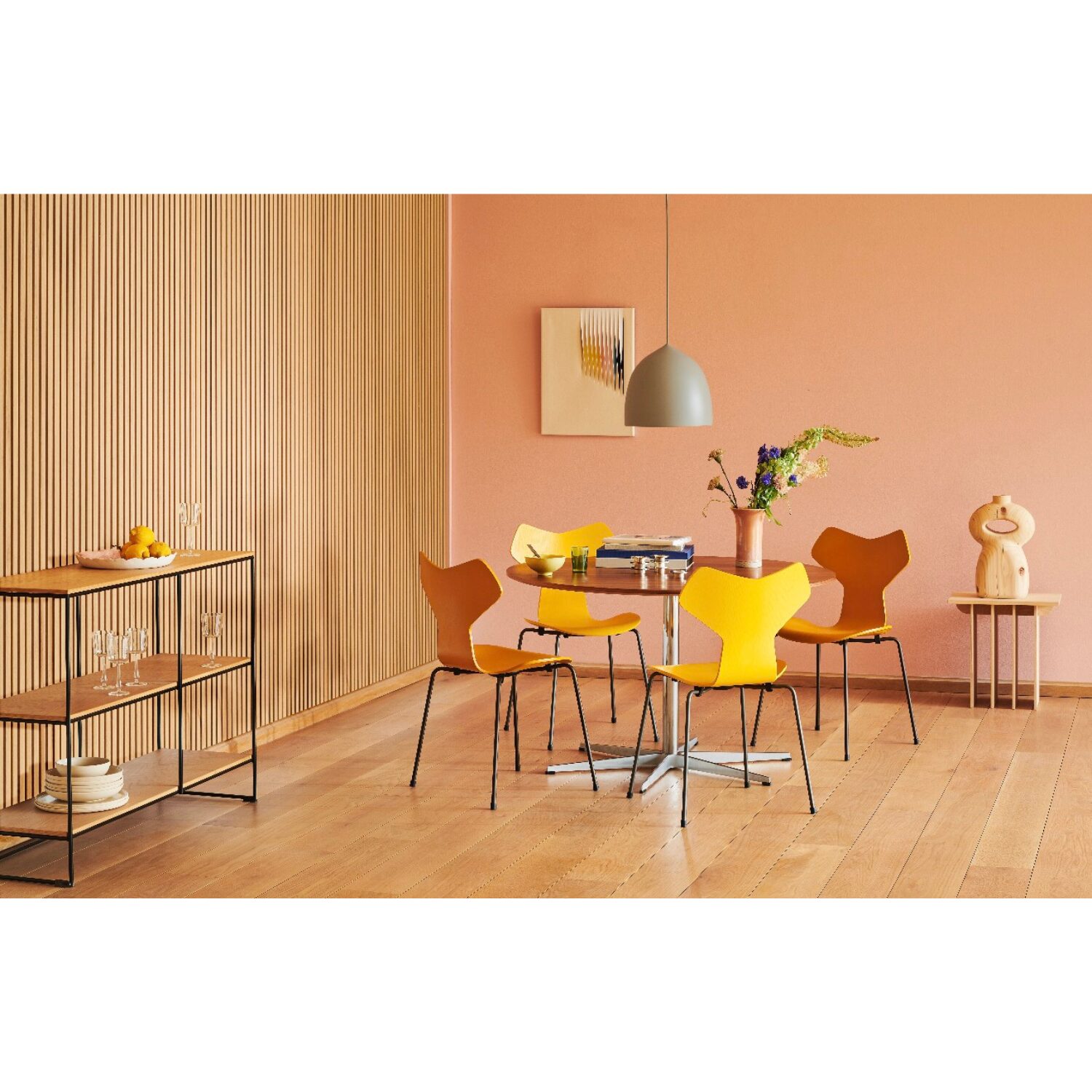 La carcasa de madera curvada demuestra el dominio técnico de Fritz Hansen en el trabajo con chapas moldeadas, mientras que la base metálica aporta estabilidad, durabilidad y un marcado carácter gráfico. El resultado es una silla robusta y ligera al mismo tiempo, diseñada para un uso prolongado sin comprometer la estética.