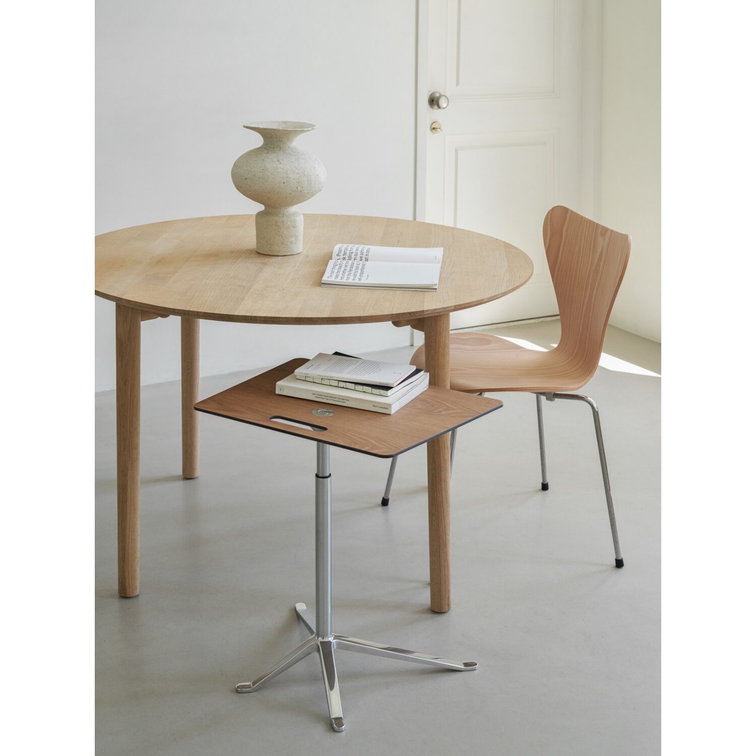 Su diseño permite combinarla fácilmente con sillas de distintos estilos, desde propuestas nórdicas hasta opciones más contemporáneas, manteniendo siempre una lectura armónica del conjunto. La hven table fritz hansen no domina el espacio, sino que lo organiza desde la discreción y el equilibrio.