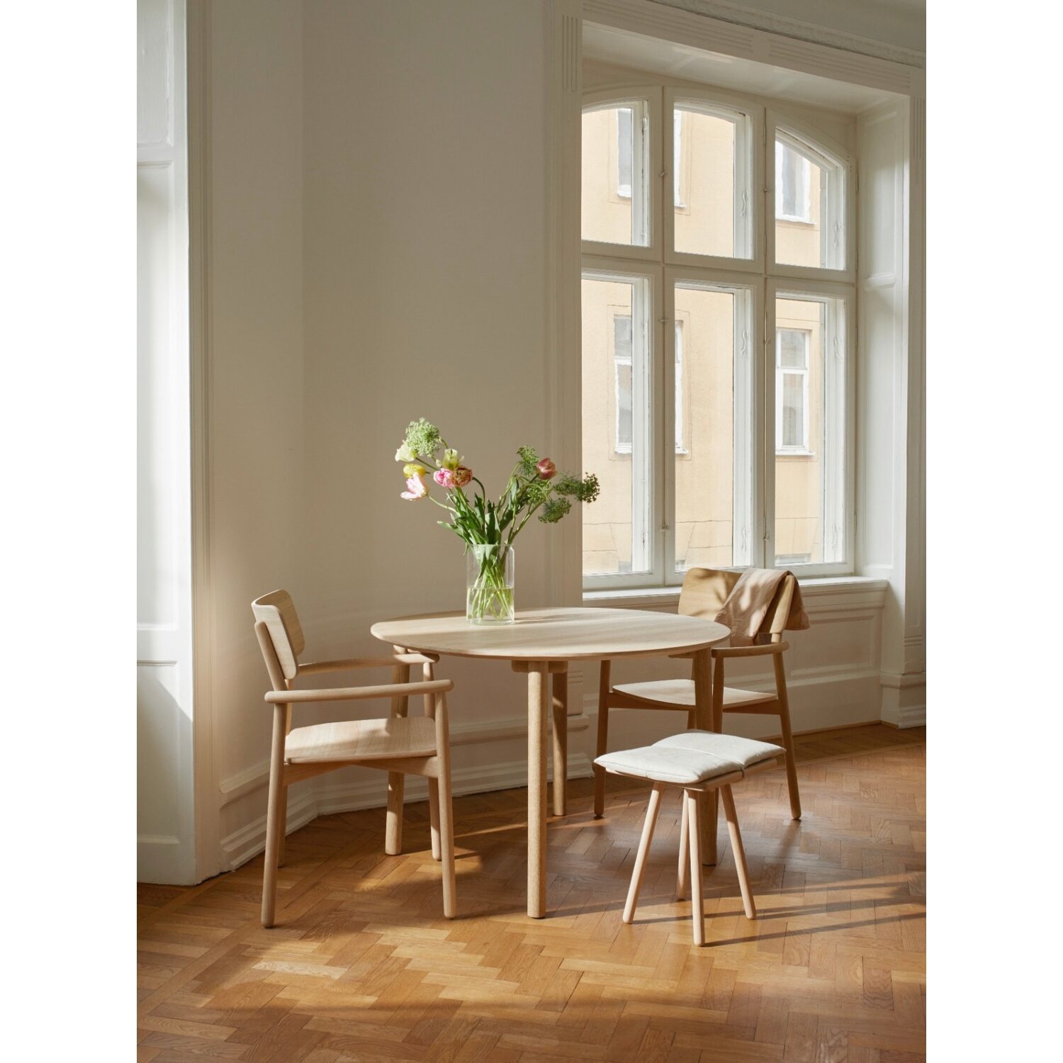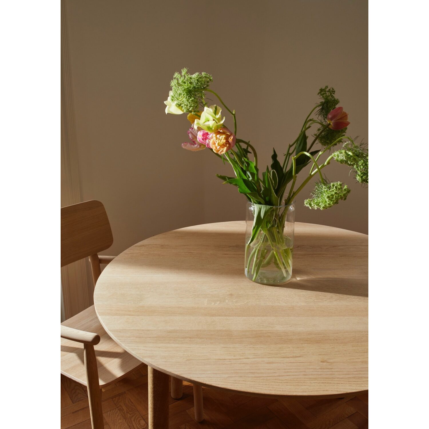 El roble macizo aporta resistencia y longevidad, mientras que su acabado natural permite que la mesa evolucione con el tiempo, adquiriendo una pátina propia que refuerza su carácter. Cada HVEN Table es ligeramente distinta, reflejo de la singularidad de la madera y del cuidado en su fabricación.