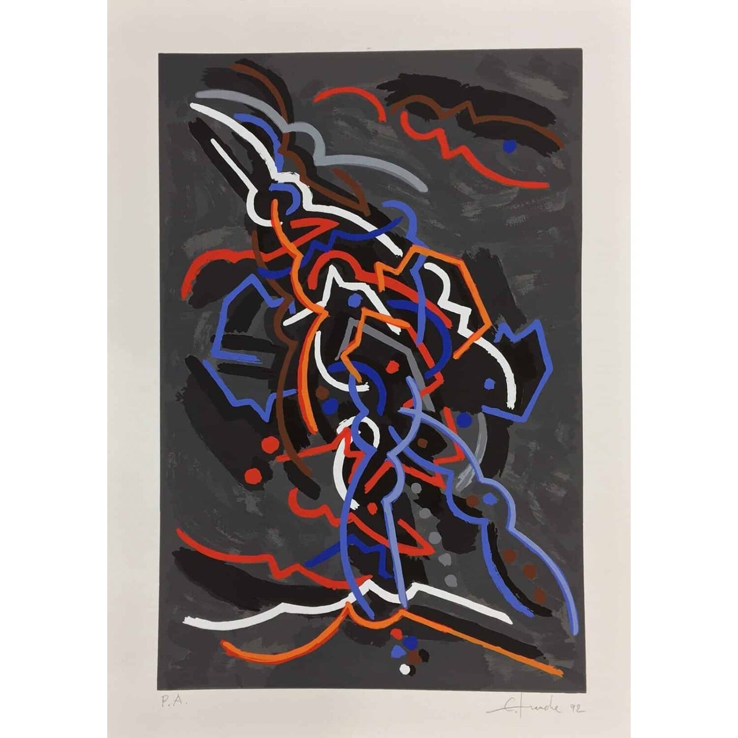 Se trata de una serigrafía que recoge con fuerza el estilo característico de Tranche: una danza visual de líneas y colores que se entrelazan en una composición enérgica y vibrante, donde el movimiento se convierte en lenguaje.