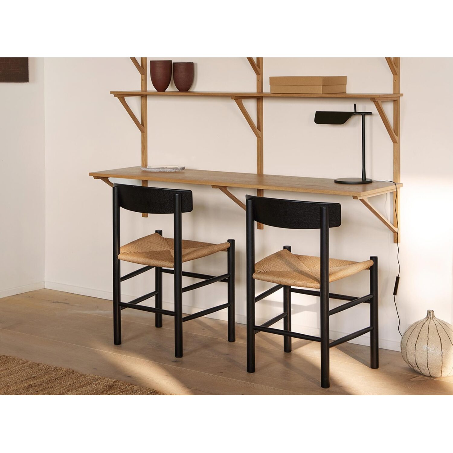 J39 Mogensen Chair Beech Black Lacquer, diseñada por el maestro danés Børge Mogensen en 1947, es una pieza icónica del diseño escandinavo moderno. Fabricada en madera maciza de haya lacada en negro con asiento trenzado en cuerda de papel natural, representa la unión perfecta entre artesanía atemporal, belleza funcional y simplicidad esencial.
