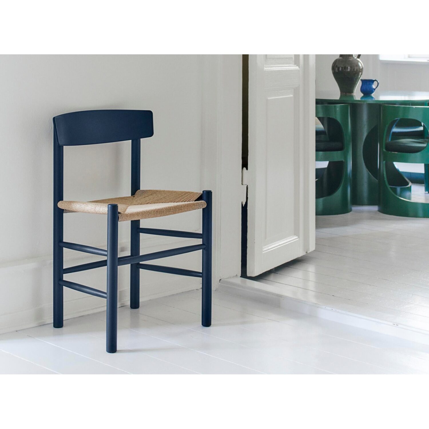 J39 Mogensen Chair Beech Indigo Blue, diseñada por Børge Mogensen, combina madera de haya color azul índigo y asiento de cuerda de papel natural. Un clásico del diseño danés moderno que une belleza, durabilidad y comodidad.