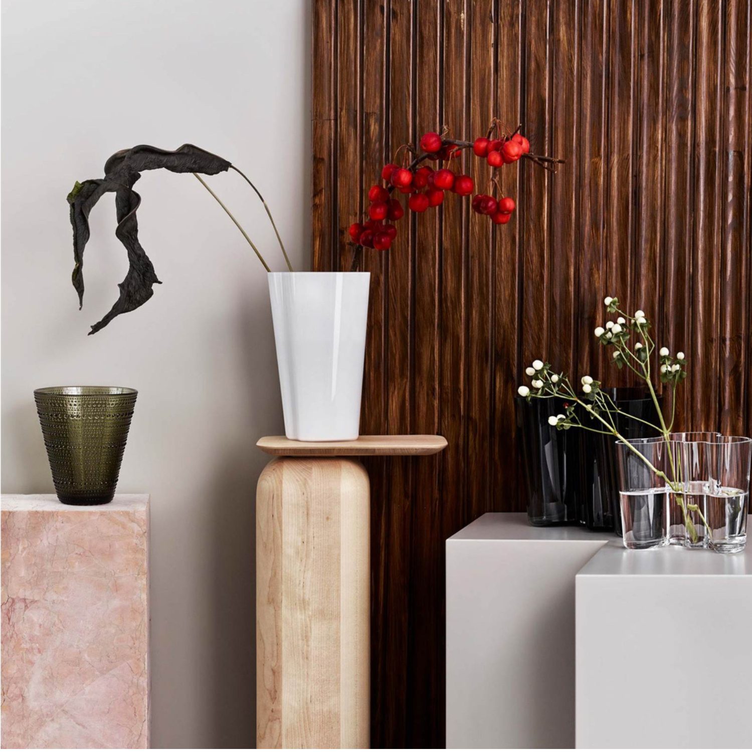 La Alvar Aalto Collection incluye jarrones en diferentes tamaños y colores, además de piezas complementarias desarrolladas en colaboración con Pentagon Design.