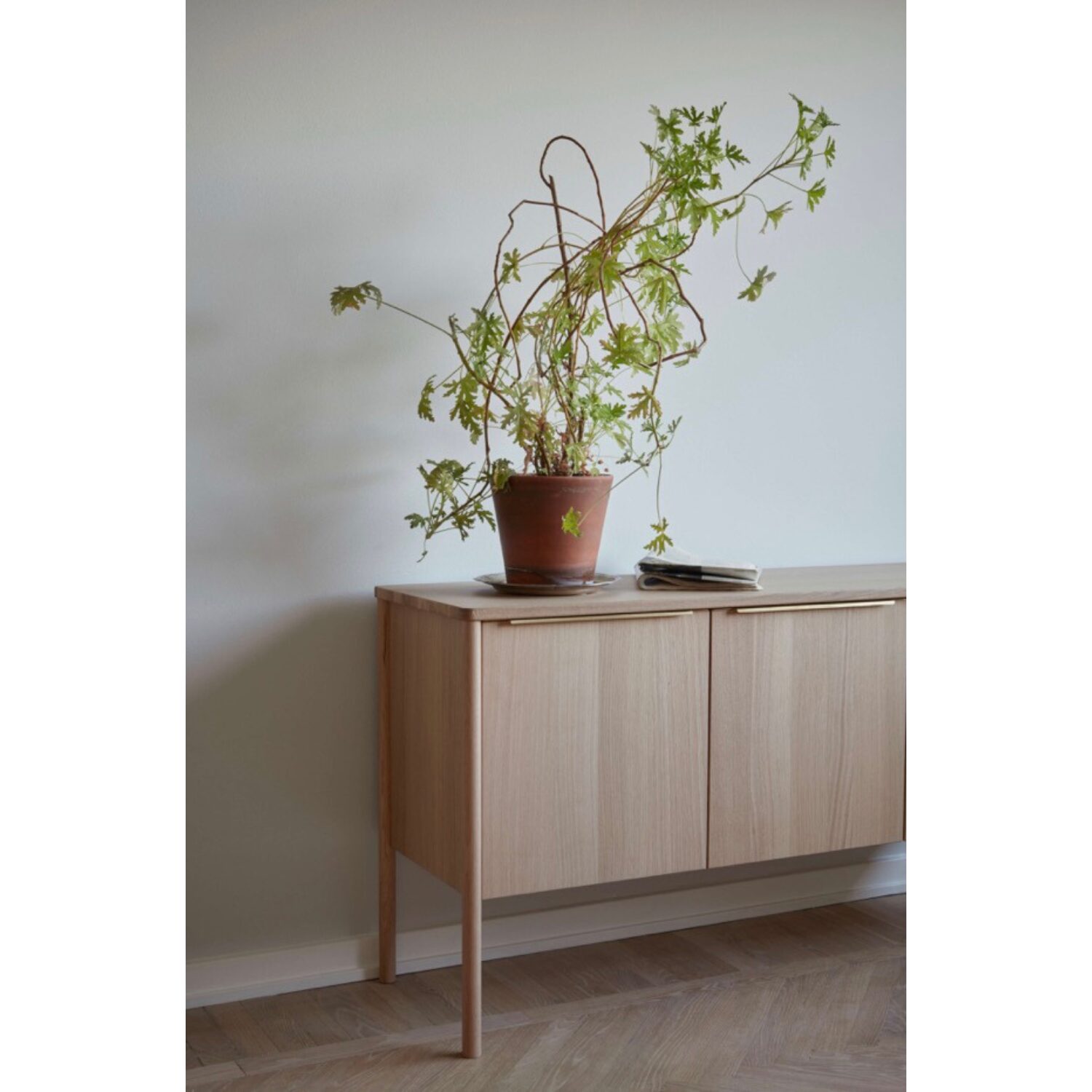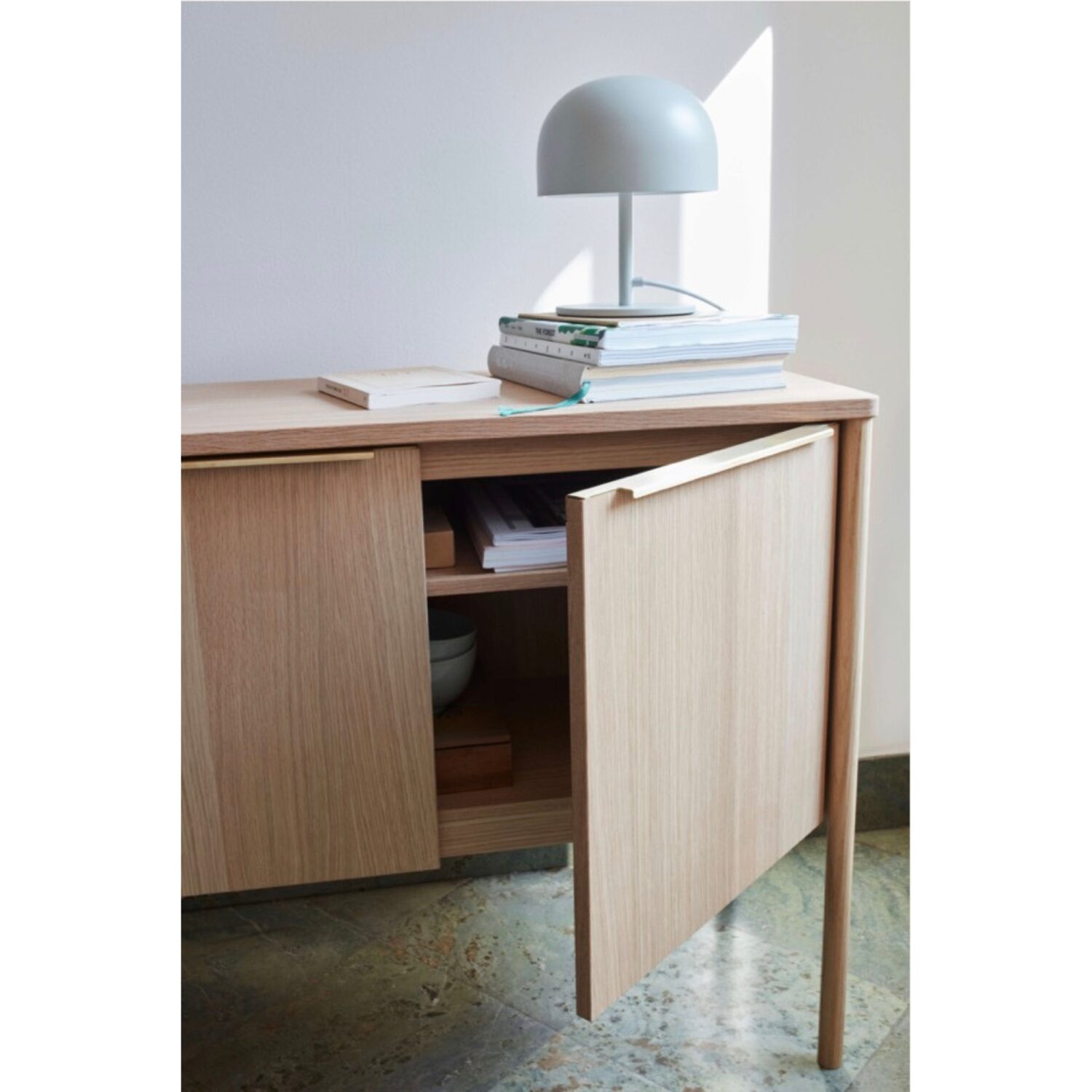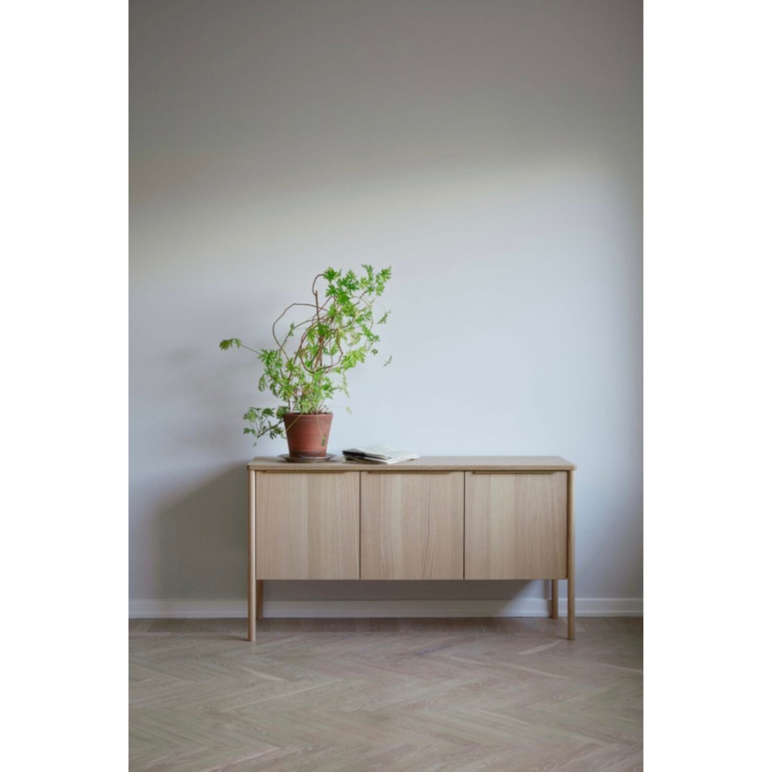Las patas largas y redondeadas, situadas en los extremos del mueble, refuerzan la estabilidad y al mismo tiempo aportan una expresión ligera y contemporánea. Este equilibrio entre solidez y ligereza es uno de los rasgos más característicos del diseño nórdico actual y define claramente el carácter del JUT Cabinet.