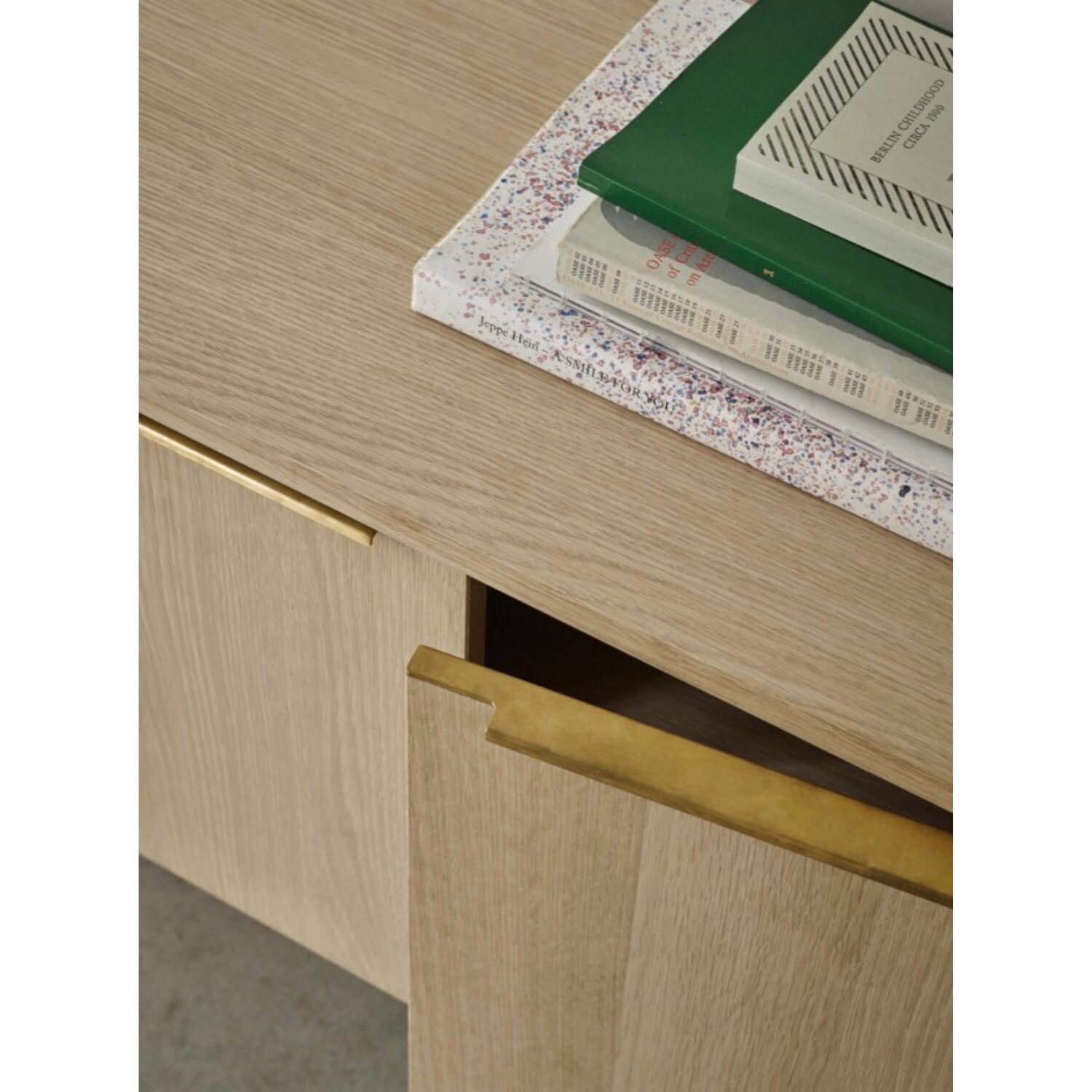 JUT Cabinet de Fritz Hansen, diseñado por Thomas Jenkins, fabricado en roble macizo aceitado con tiradores de latón y diseño nórdico contemporáneo. Mueble de almacenaje elegante, funcional y atemporal.
