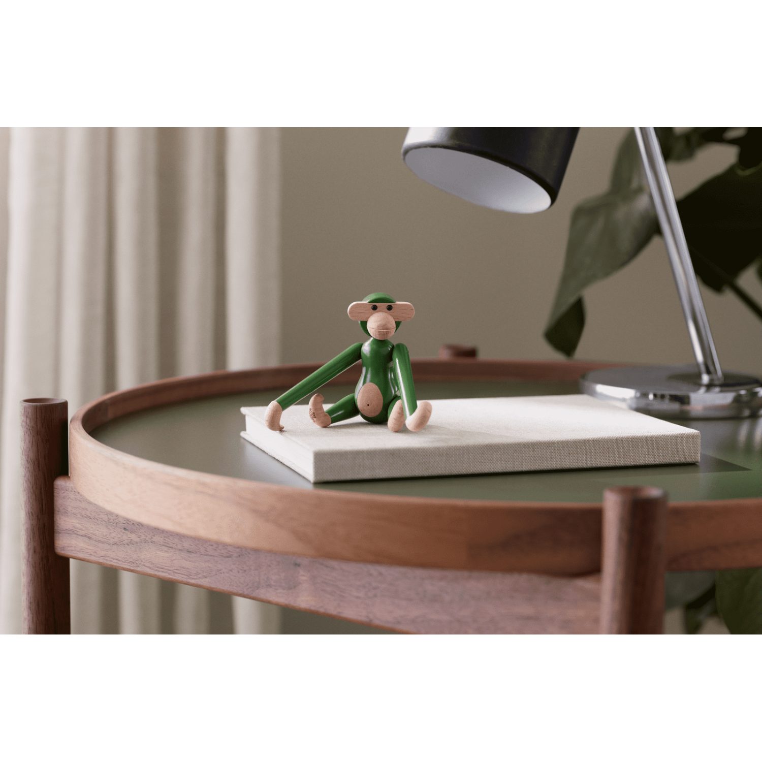 Fabricado en madera de haya pintada con certificación FSC®, el Monkey Mini Vintage Green destaca por su contraste entre el verde profundo y los detalles en madera natural en manos, pies, cara y barriga. Esta combinación resalta su personalidad juguetona y lo convierte en una pieza única y versátil, capaz de integrarse en interiores modernos o clásicos.