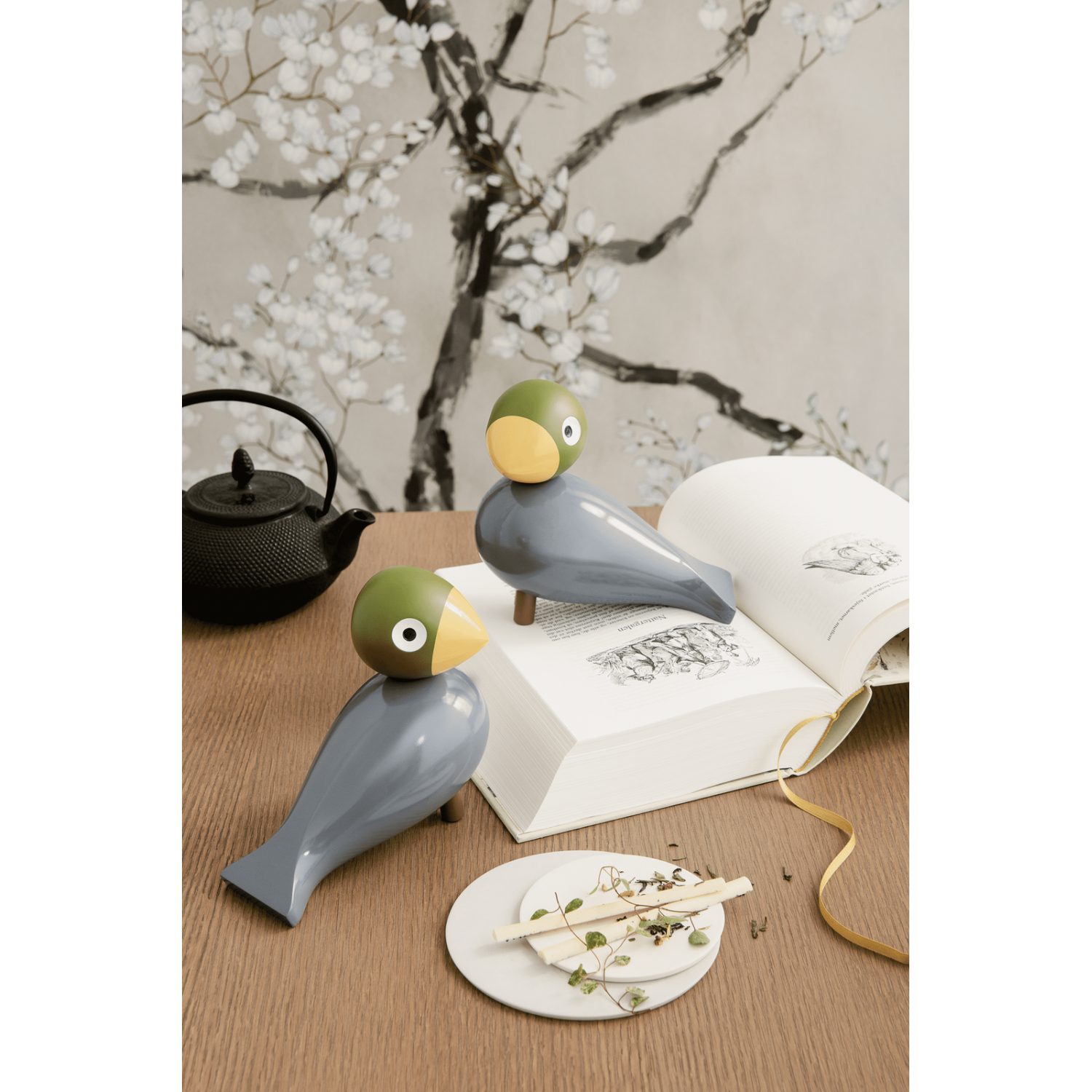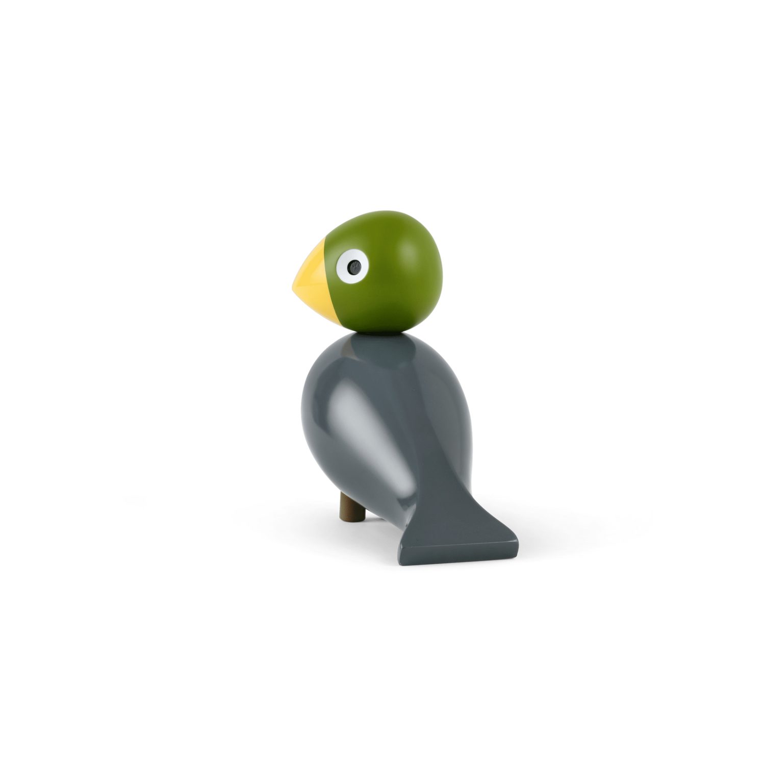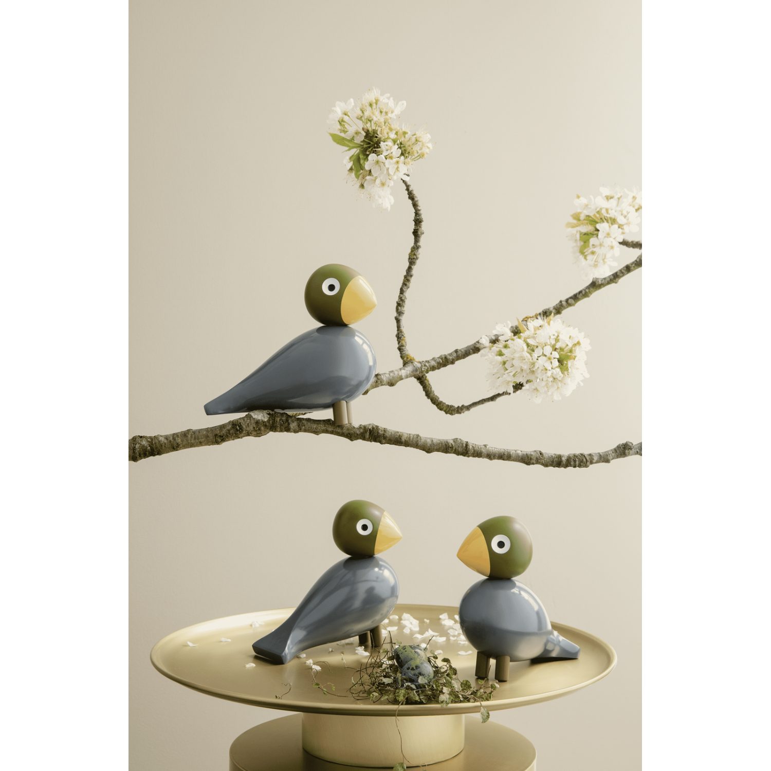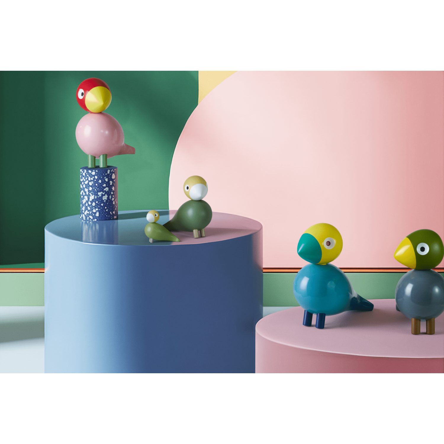 Fabricado en madera de haya pintada con certificación FSC®, este pájaro cantor mide 15,5 cm de altura y presenta un diseño colorido que combina el verde oliva, el amarillo mostaza y el gris azulado. Su acabado artesanal lo convierte en una figura cargada de simbolismo, que une tradición literaria y diseño escandinavo.