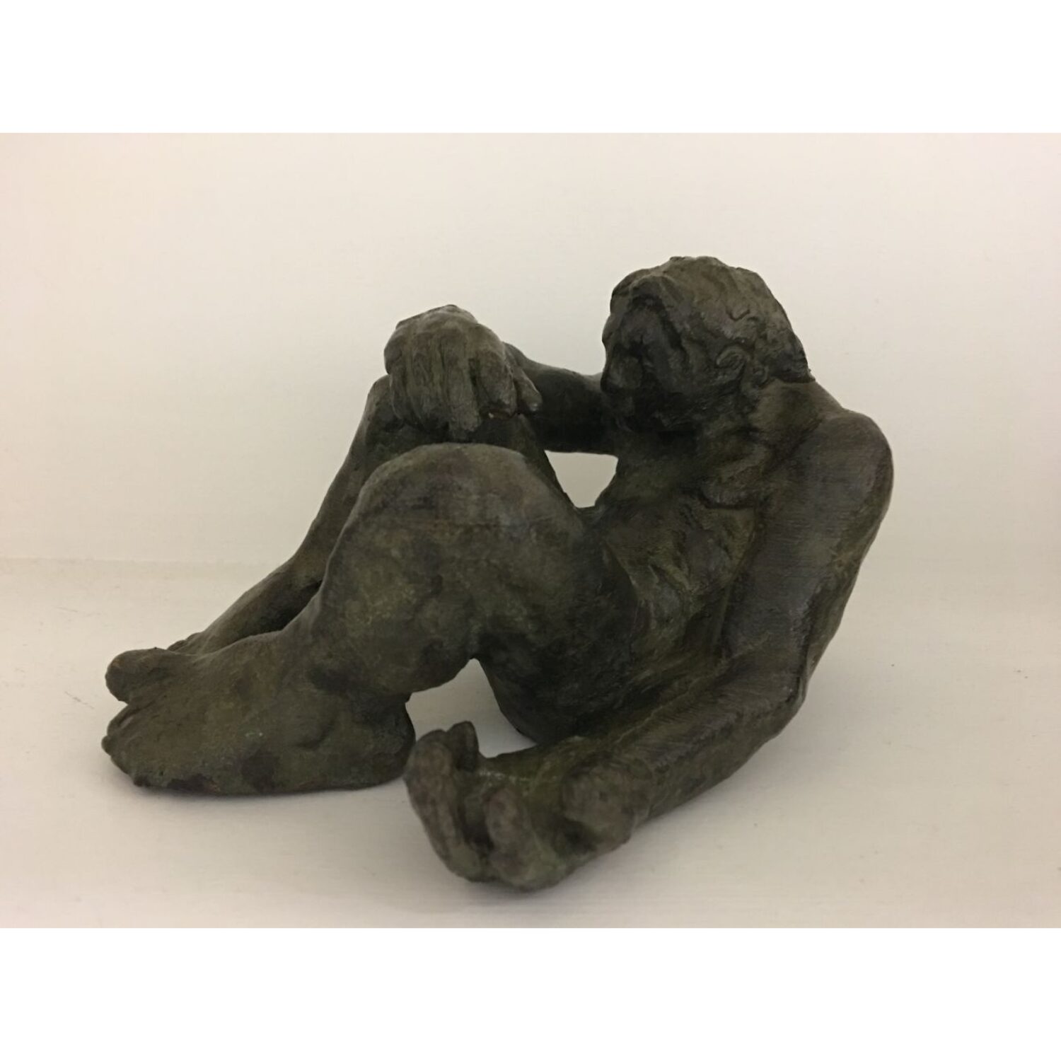A diferencia de las versiones de menor formato, La Negrilla I se impone por su escala más amplia y su presencia física rotunda. Con unas dimensiones de 14 × 27 × 18 cm, la escultura adquiere un volumen dominante que refuerza su lectura corporal. La figura aparece sentada y recogida, con las extremidades plegadas y el gesto concentrado hacia el interior, generando una sensación inmediata de introspección profunda y resistencia contenida.