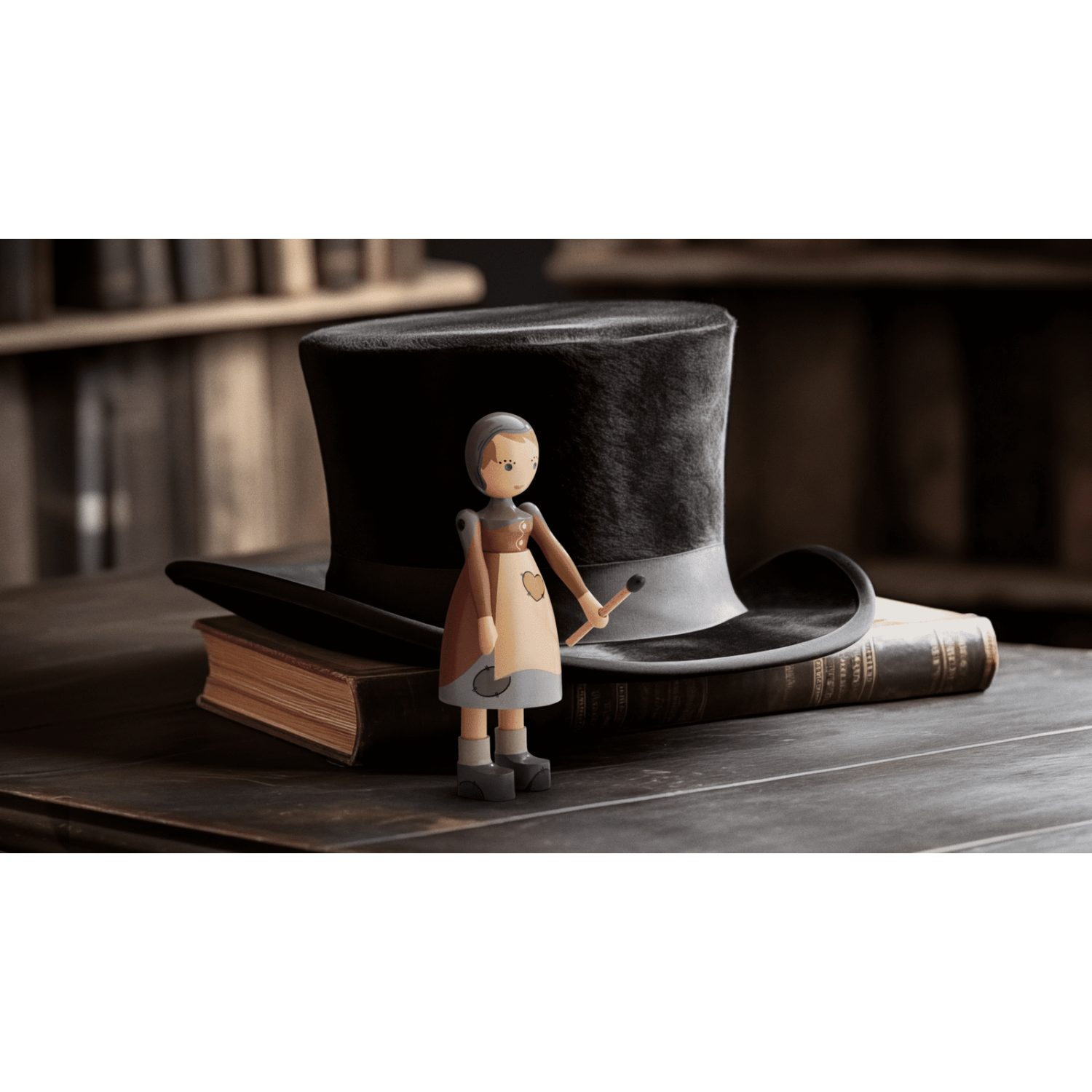Vestida con un delantal con parches pintados a mano y una capa que le cae sobre los hombros, transmite tanto fragilidad como esperanza. En su mano sostiene un fósforo, que completa la narración y evoca la chispa de la imaginación y los sueños.
