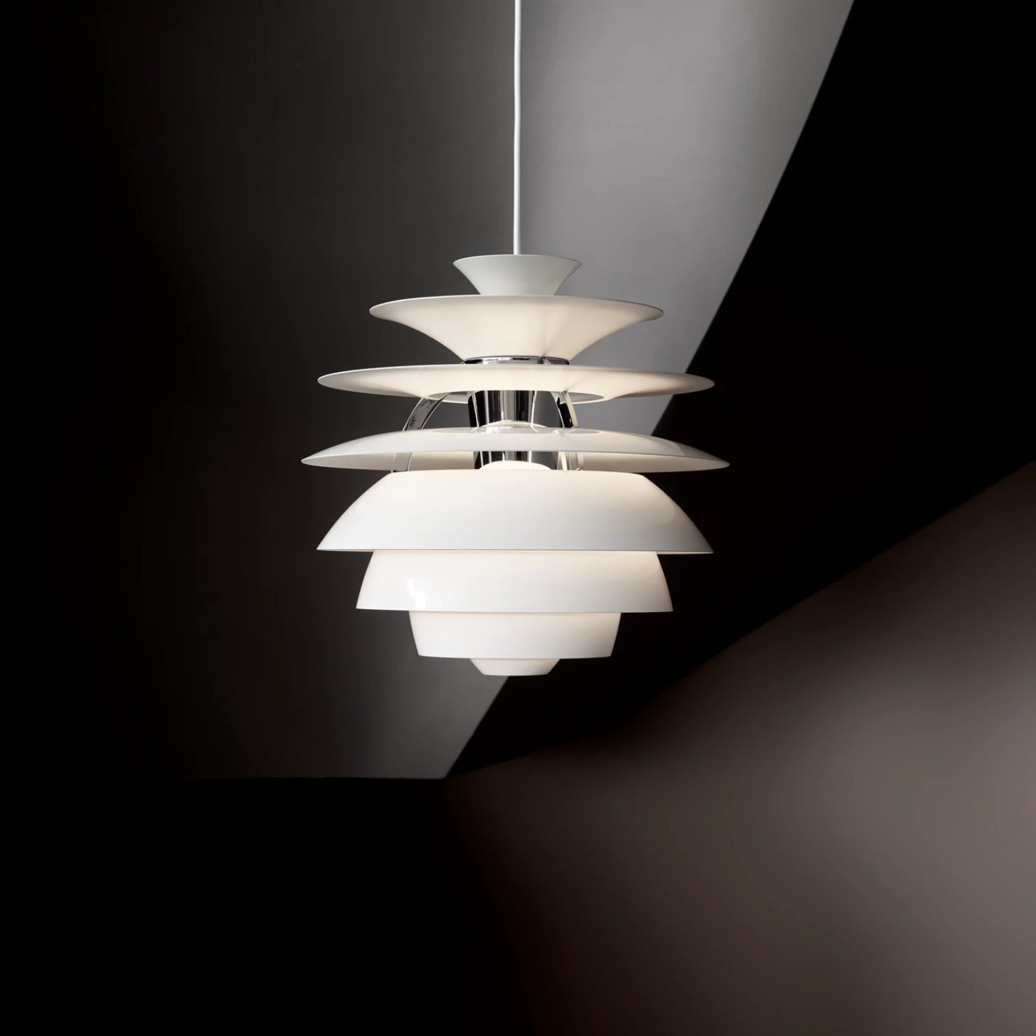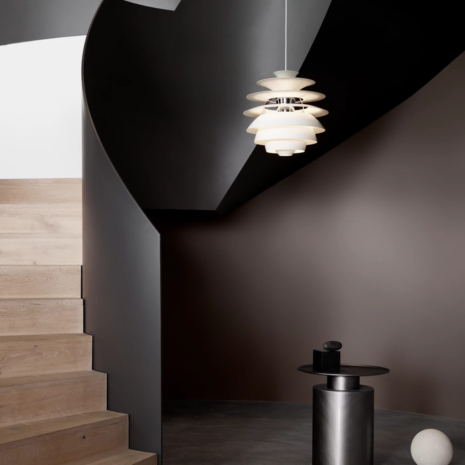 La PH Snowball es una de las luminarias más icónicas de Poul Henningsen, presentada en 1958 y producida por Louis Poulsen. Su diseño escultural y su sistema de ocho pantallas superpuestas generan una iluminación difusa, suave y 100% libre de deslumbramiento, creando atmósferas cálidas y equilibradas.