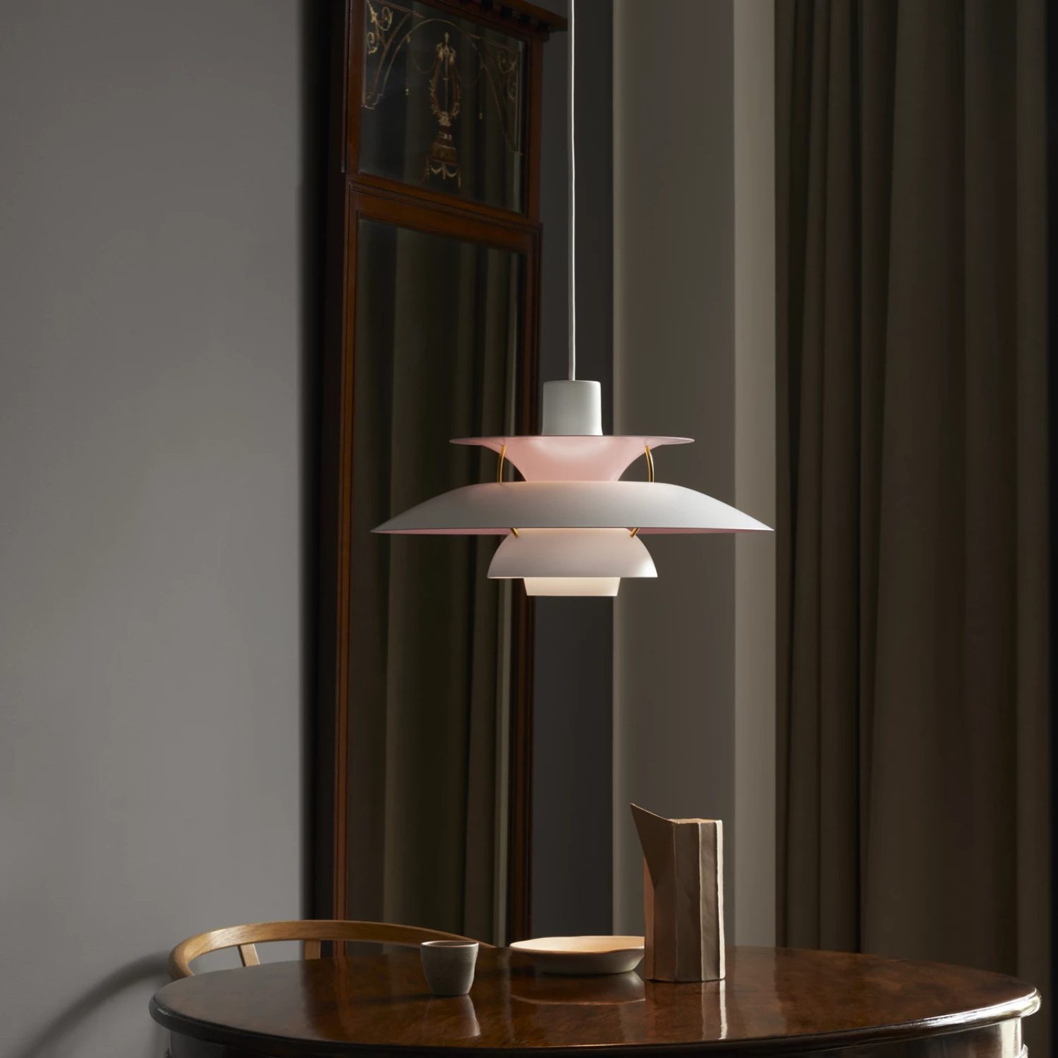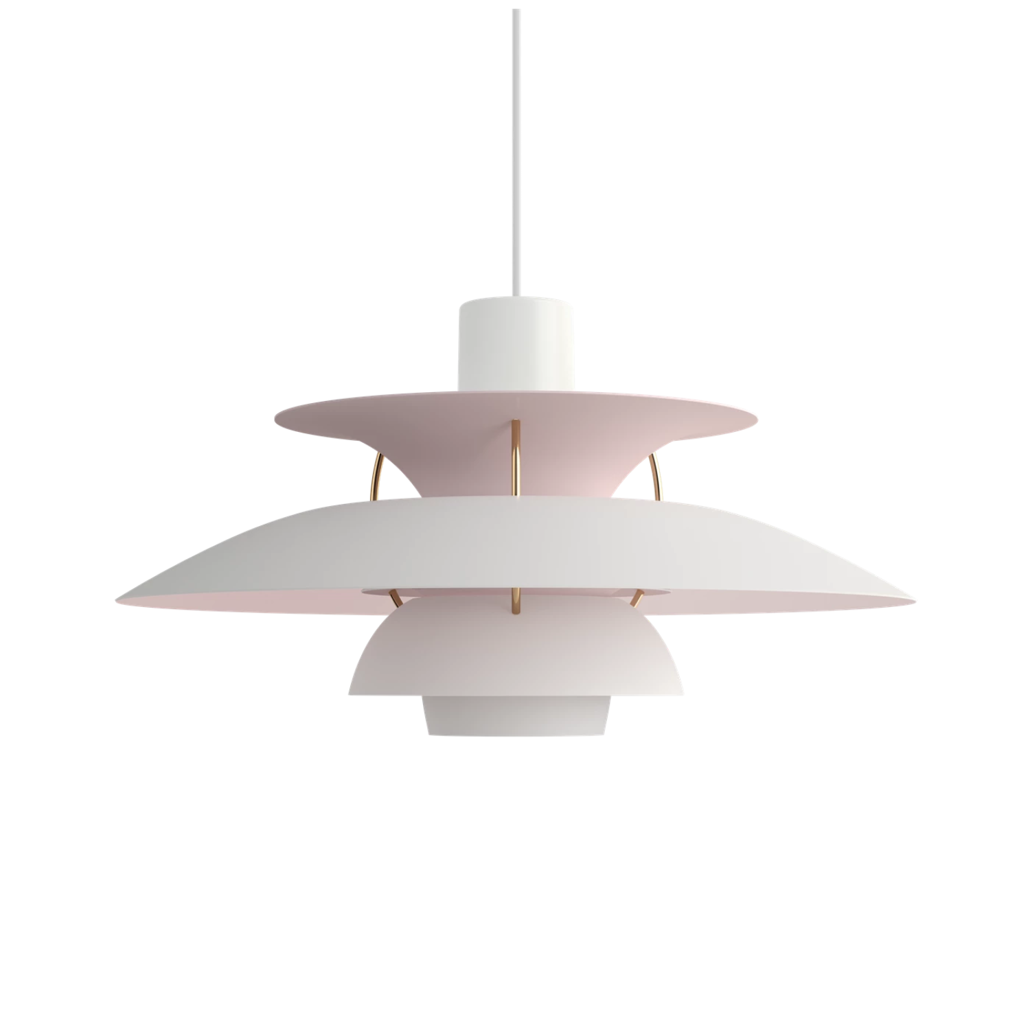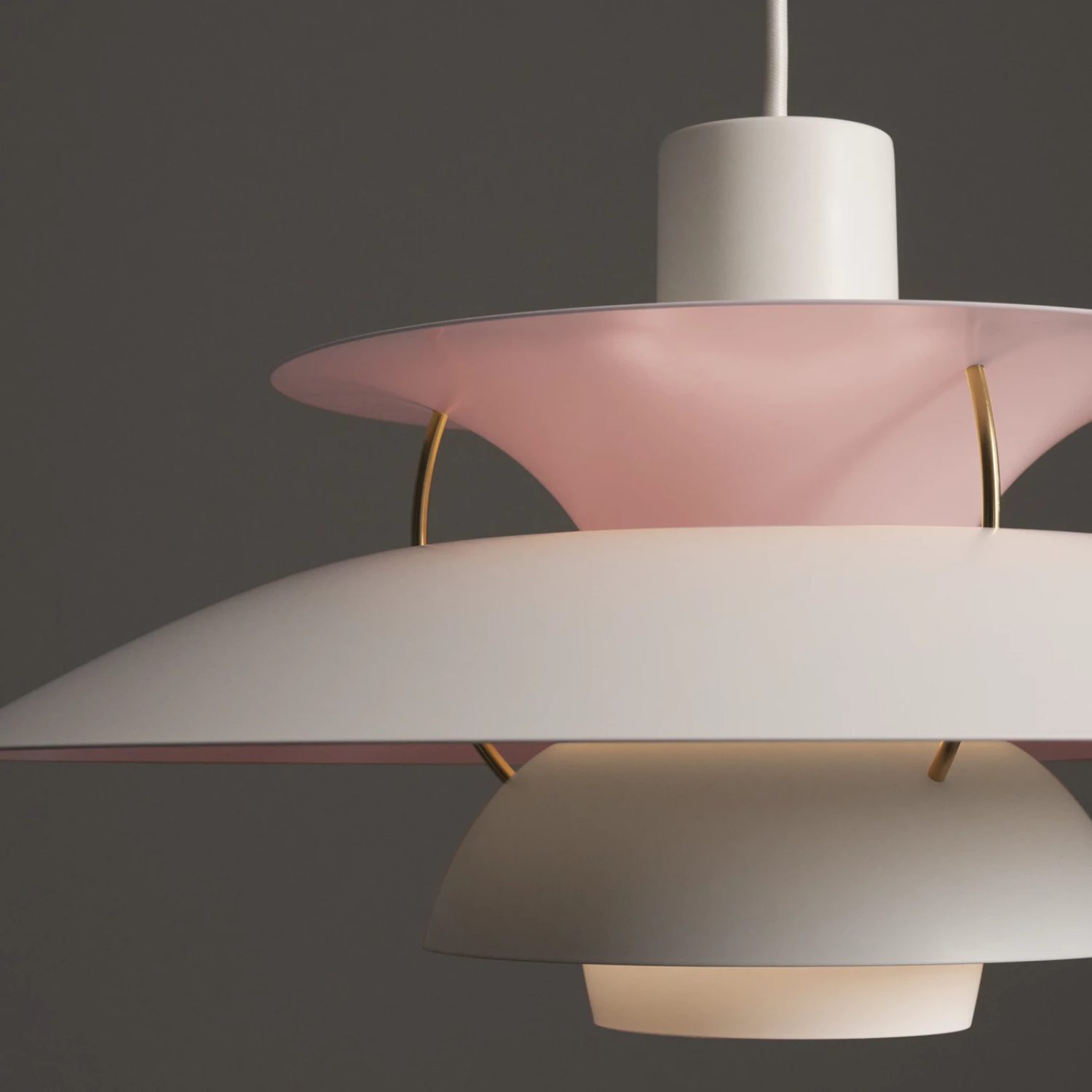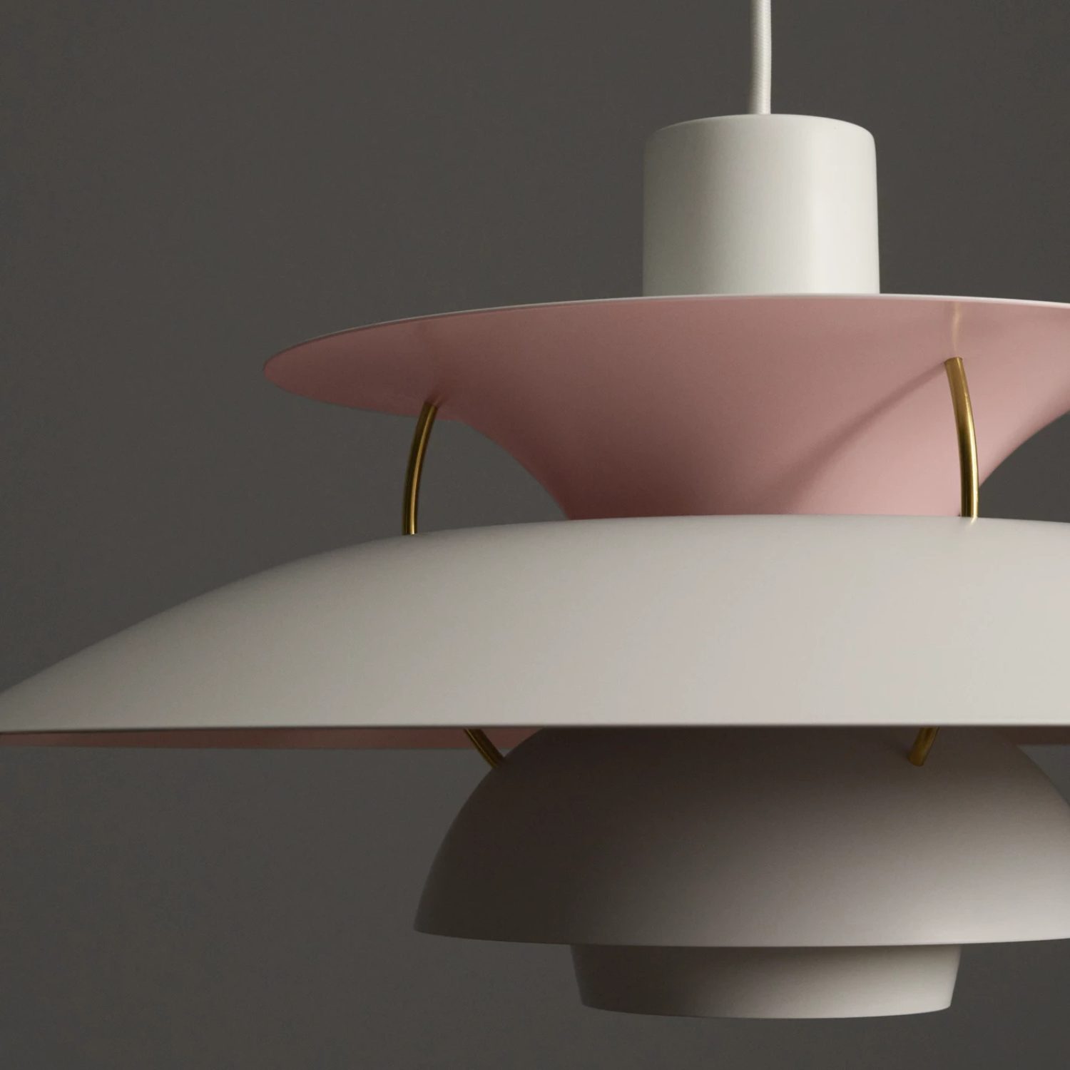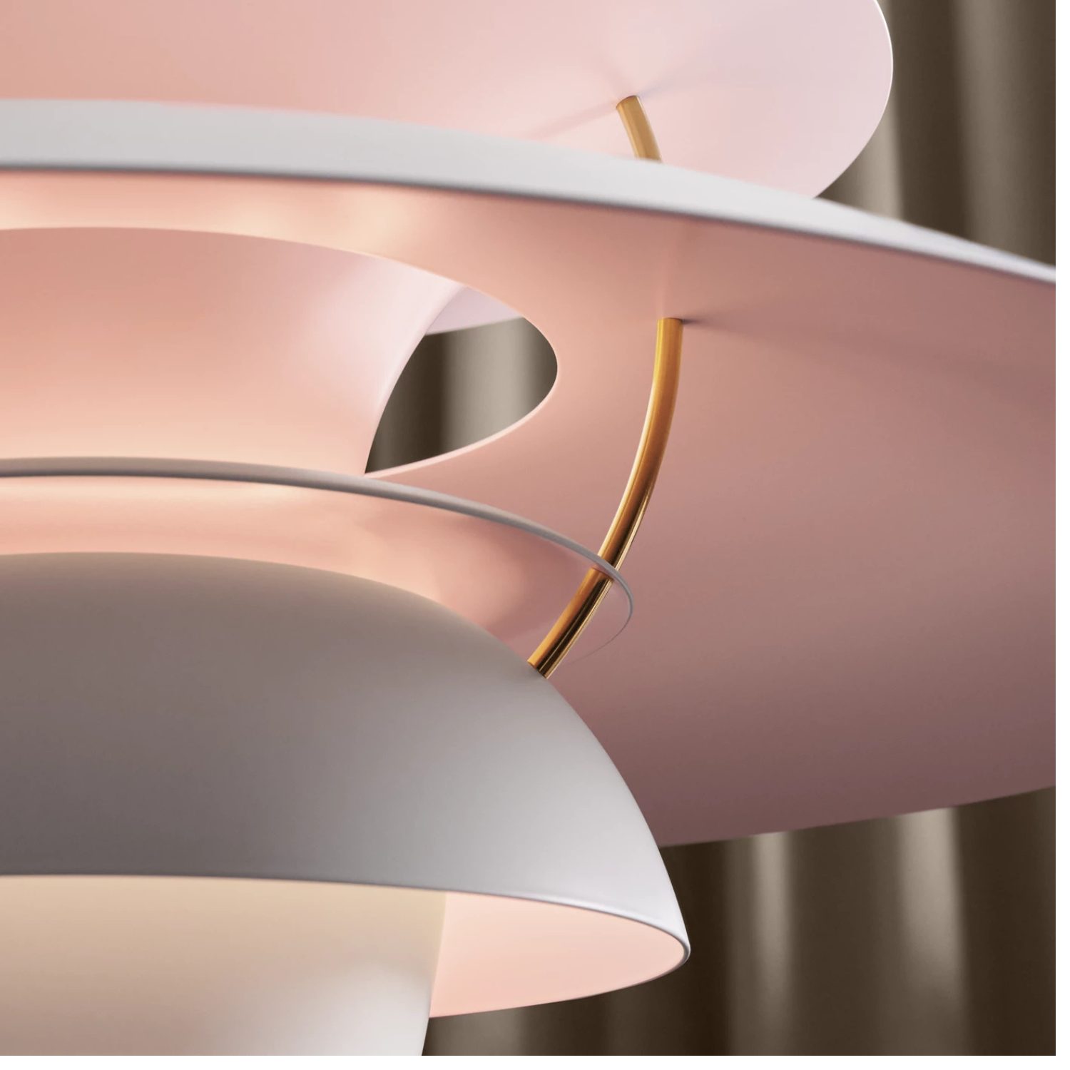Una edición especial de la icónica lámpara PH 5 diseñada por Poul Henningsen, que combina exterior blanco mate e interior rosa pálido con detalles en latón, logrando una iluminación cálida, uniforme y sin deslumbramiento.