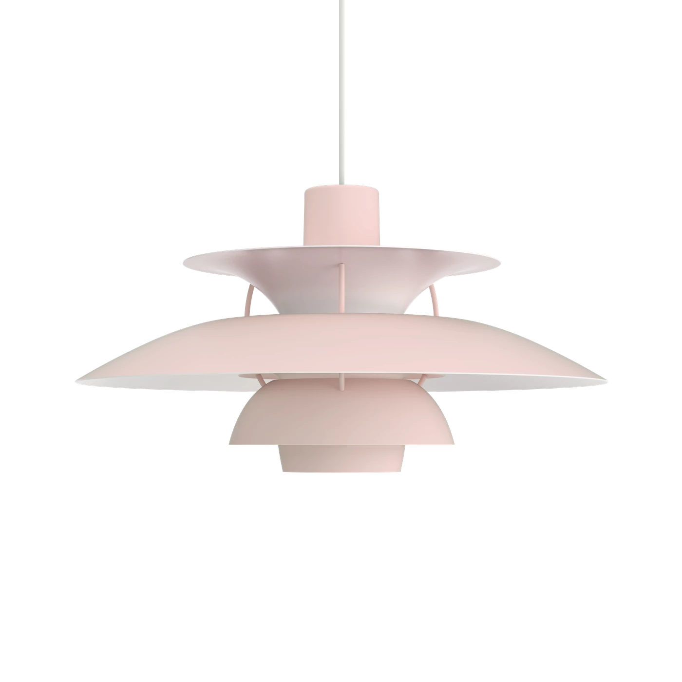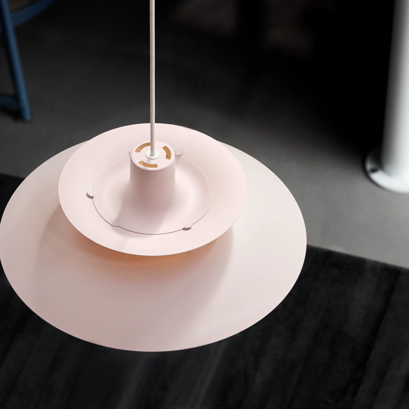 Lámpara suspendida icónica diseñada por Poul Henningsen para Louis Poulsen, con estructura multicapa que ofrece luz suave, uniforme y sin deslumbramiento, ahora en rosa pálido monocromático.