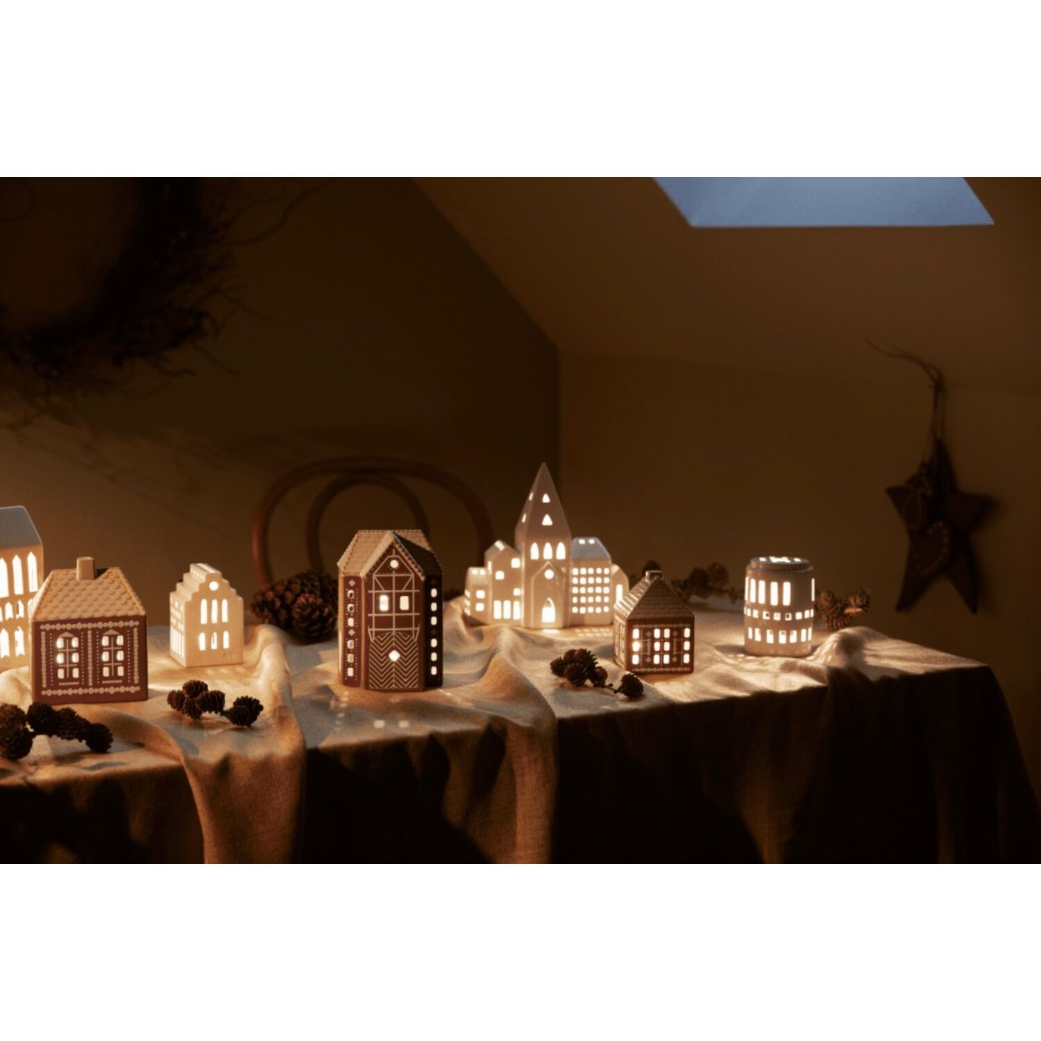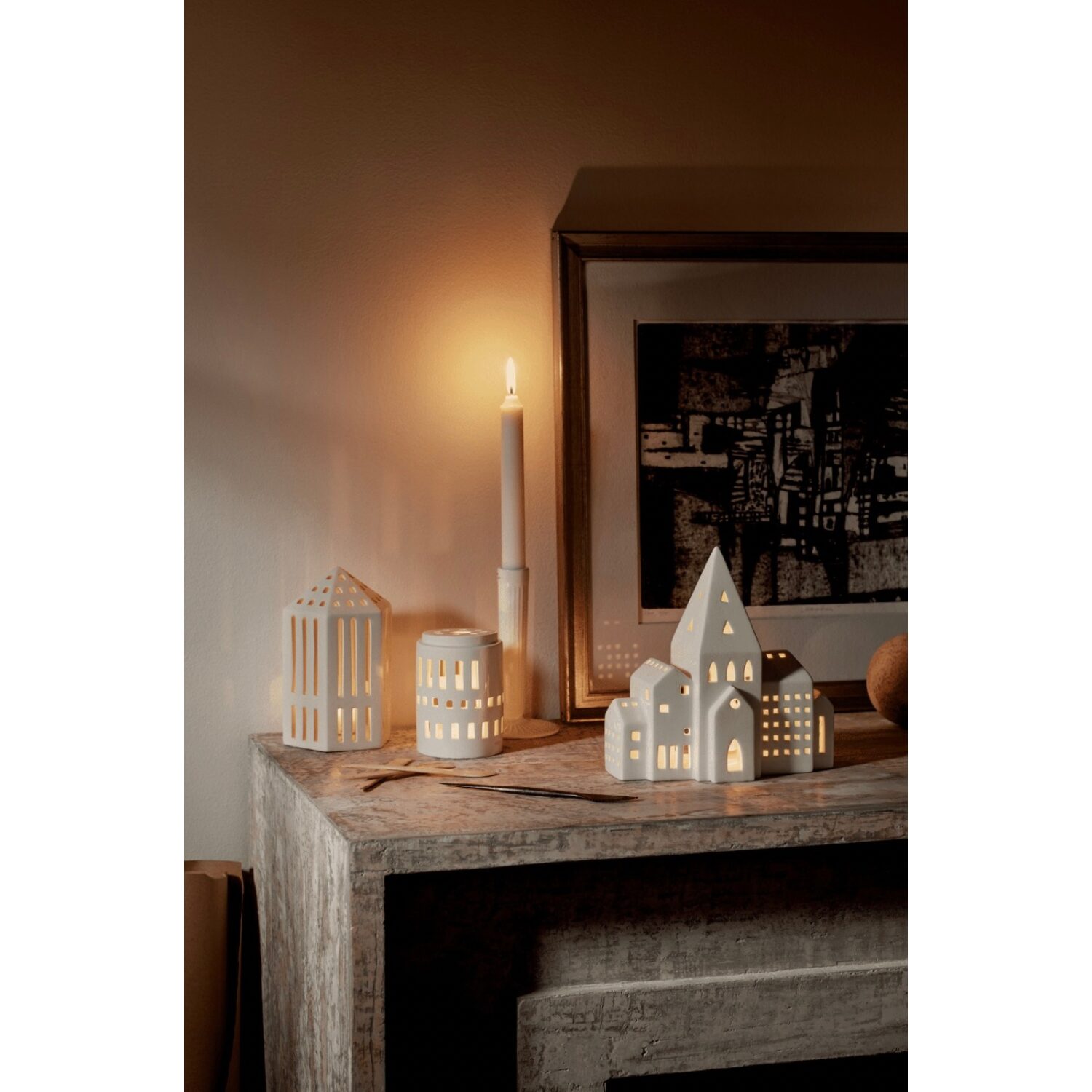 Lighthouse Little Tower H11.5 de Kähler. Casita de cerámica blanca esmaltada de 11,5 cm con aberturas cortadas a mano, inspirada en la arquitectura nórdica.