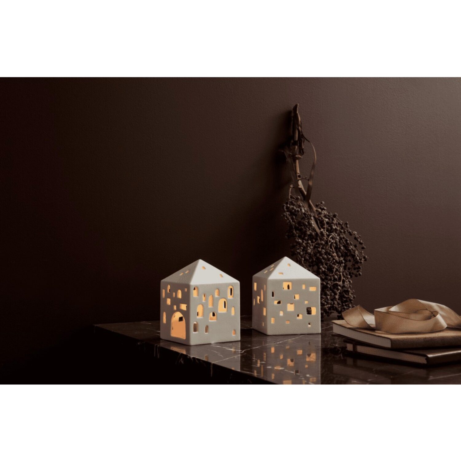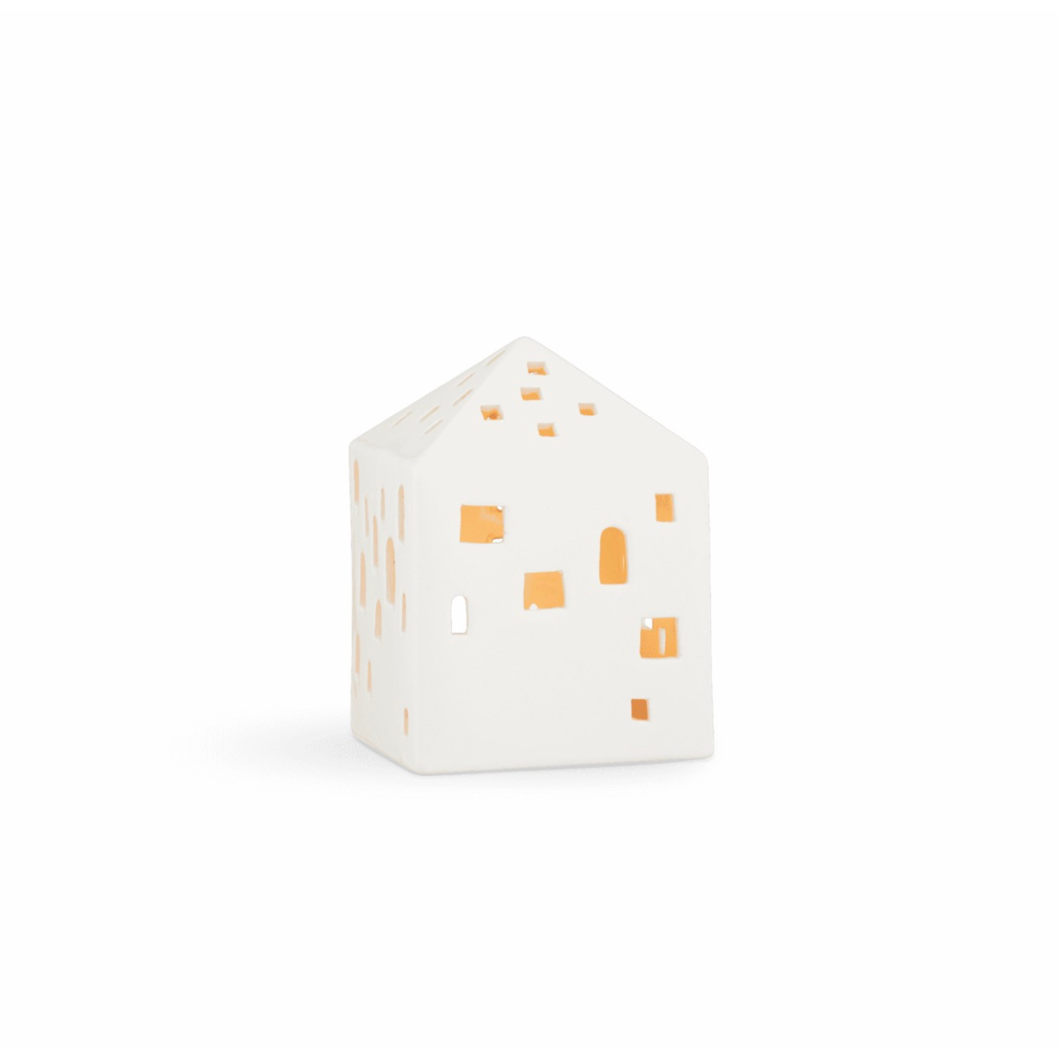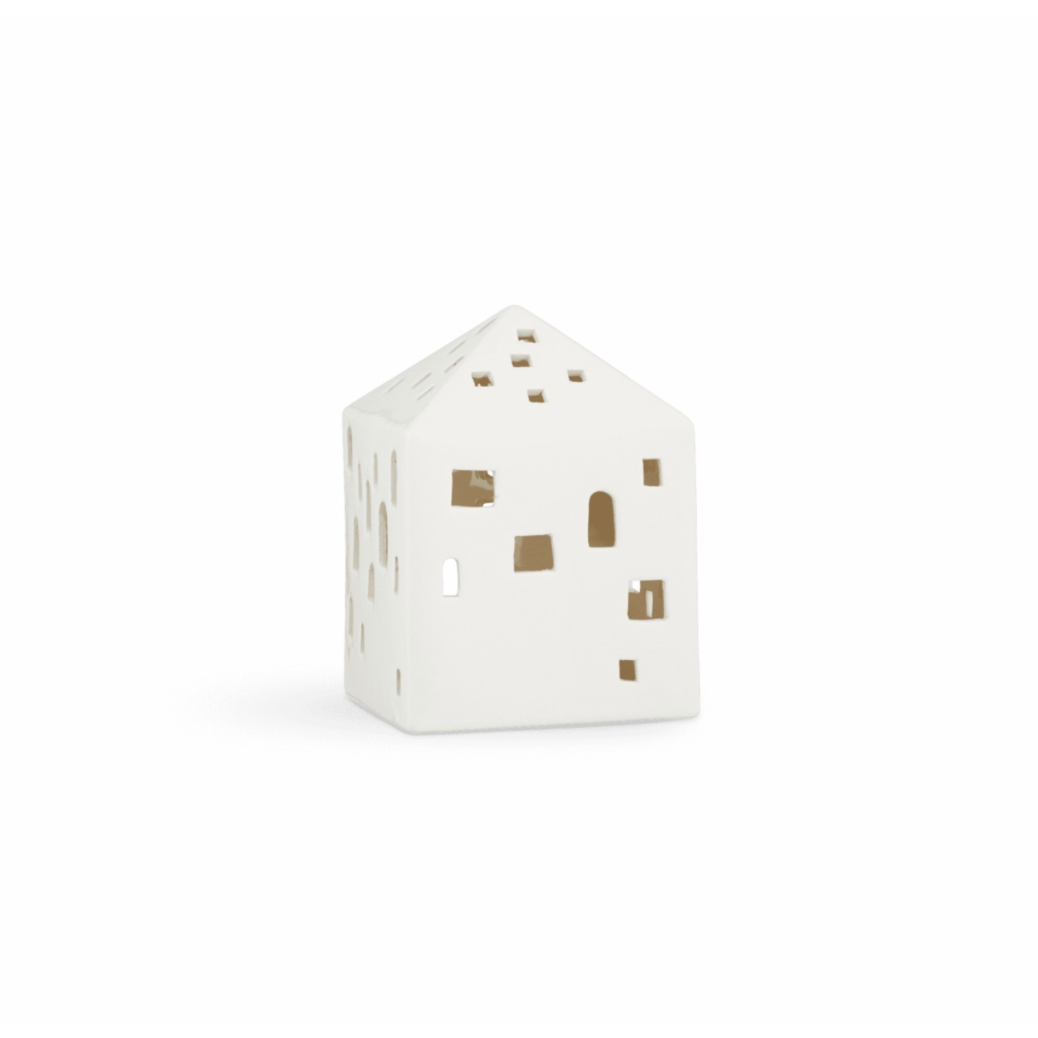 Lighthouse Town House H12.5 de Kähler. Casita de cerámica blanca esmaltada de 12,5 cm con aberturas cortadas a mano, inspirada en la arquitectura urbana clásica danesa.