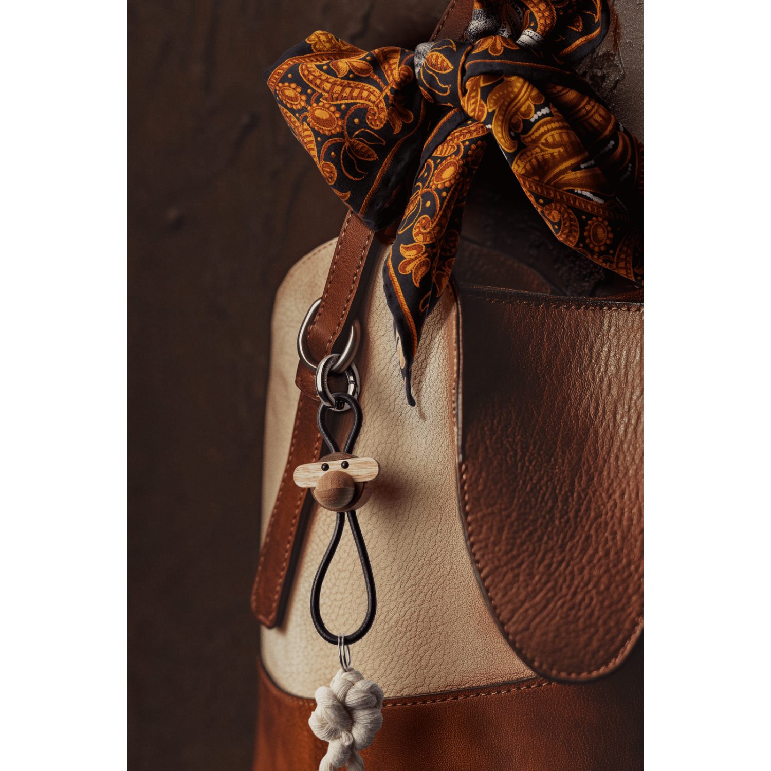El aro metálico plateado grabado con el logotipo de Kay Bojesen Denmark añade un detalle distintivo, mientras que el mosquetón funcional facilita la apertura y el cierre. Tres anillas adicionales permiten organizar cómodamente varias llaves, convirtiendo a este llavero en un accesorio tanto decorativo como útil para el día a día.