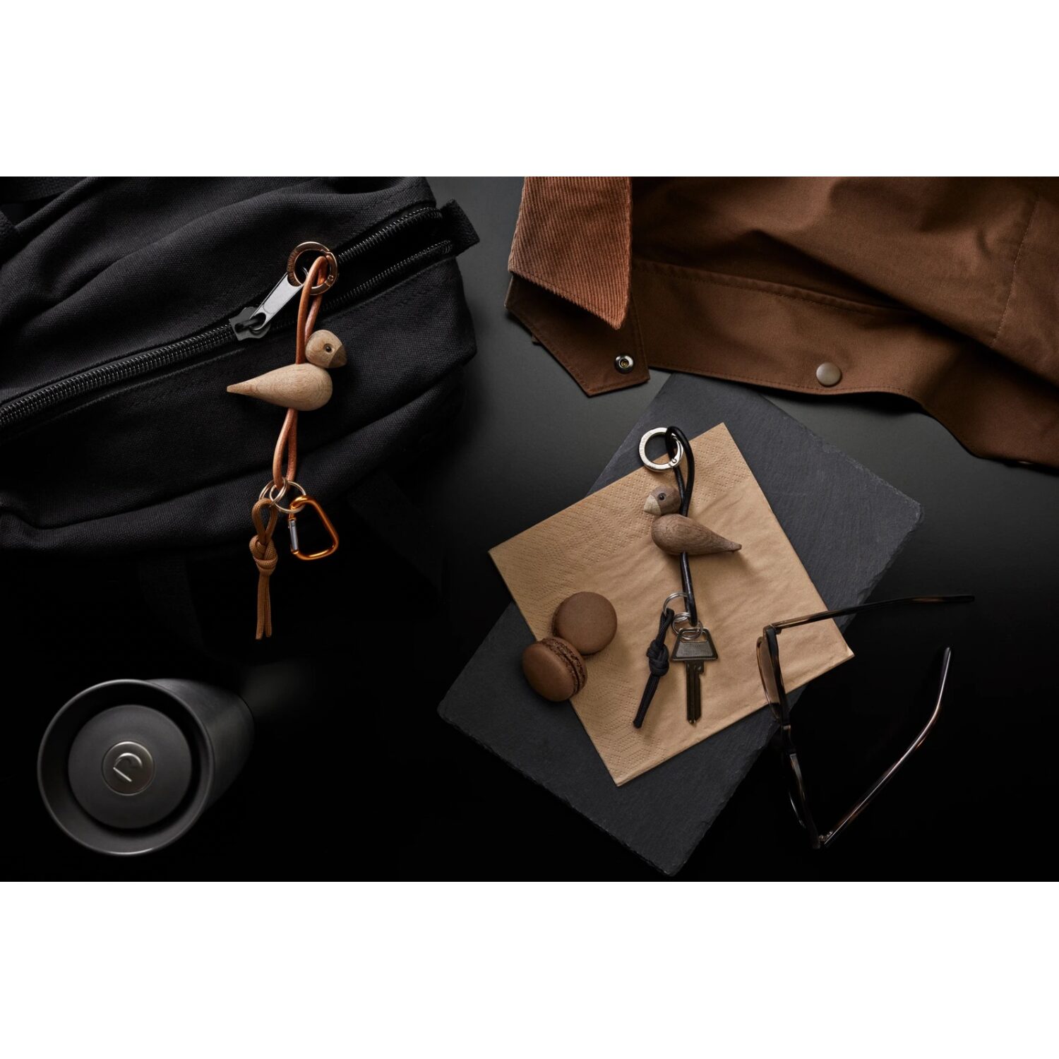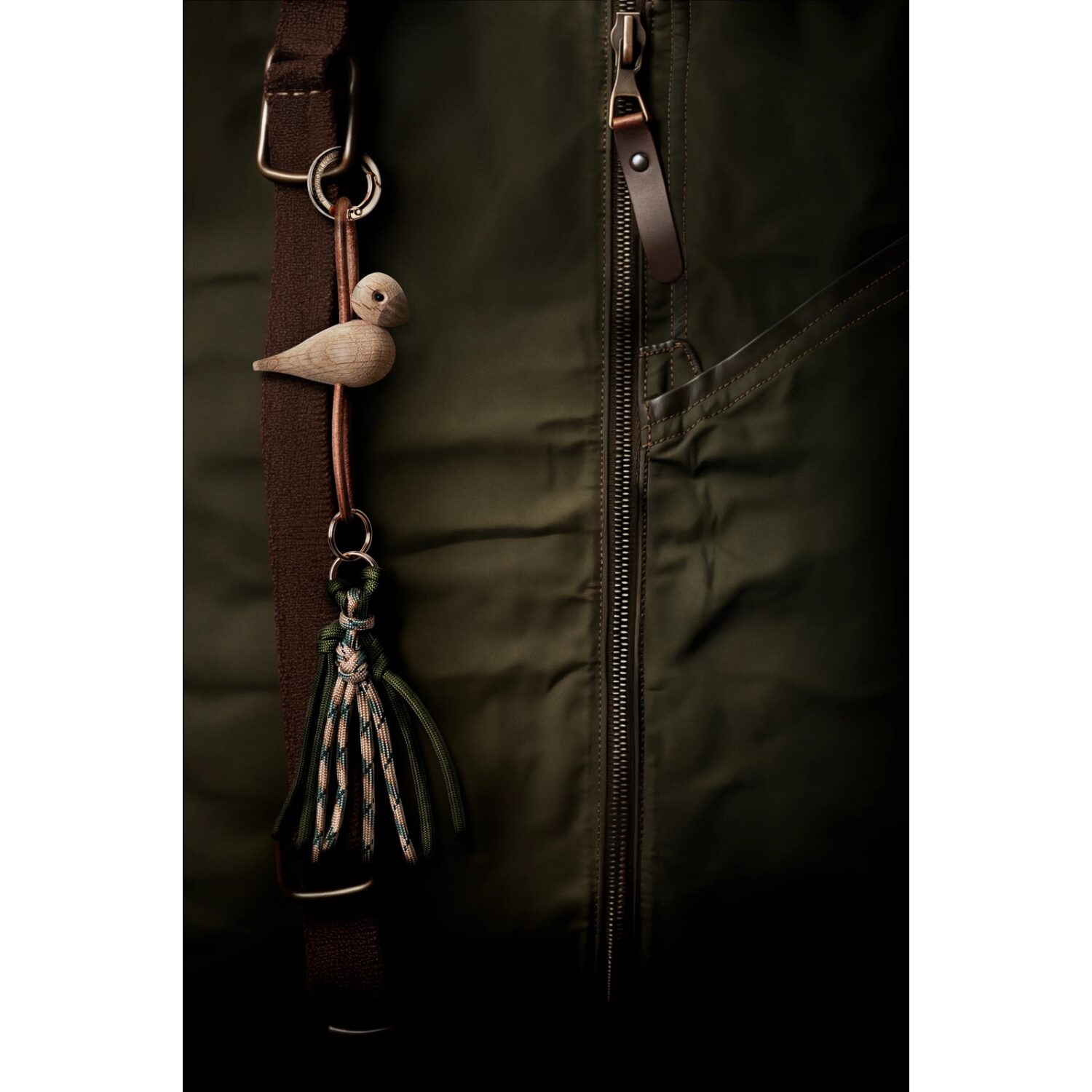 La correa de piel natural en tono neutro añade un contraste cálido y sofisticado, además de aportar flexibilidad y resistencia al conjunto. Este elemento permite ajustar la posición del pájaro en relación con el llavero, ofreciendo distintas formas de uso y personalización según la preferencia de cada persona. El resultado es un accesorio versátil que funciona tanto en bolsos y mochilas como en llaves de coche o cinturones.