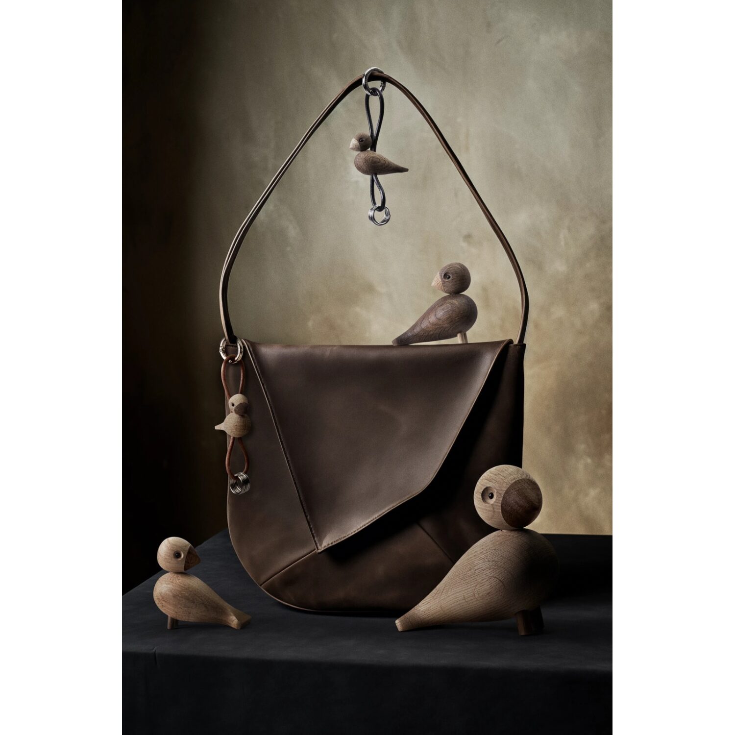 Llavero Pájaro Kay Bojesen en metal dorado con piel natural. Figura en madera de roble FSC®, diseño danés funcional y elegante con carácter icónico.