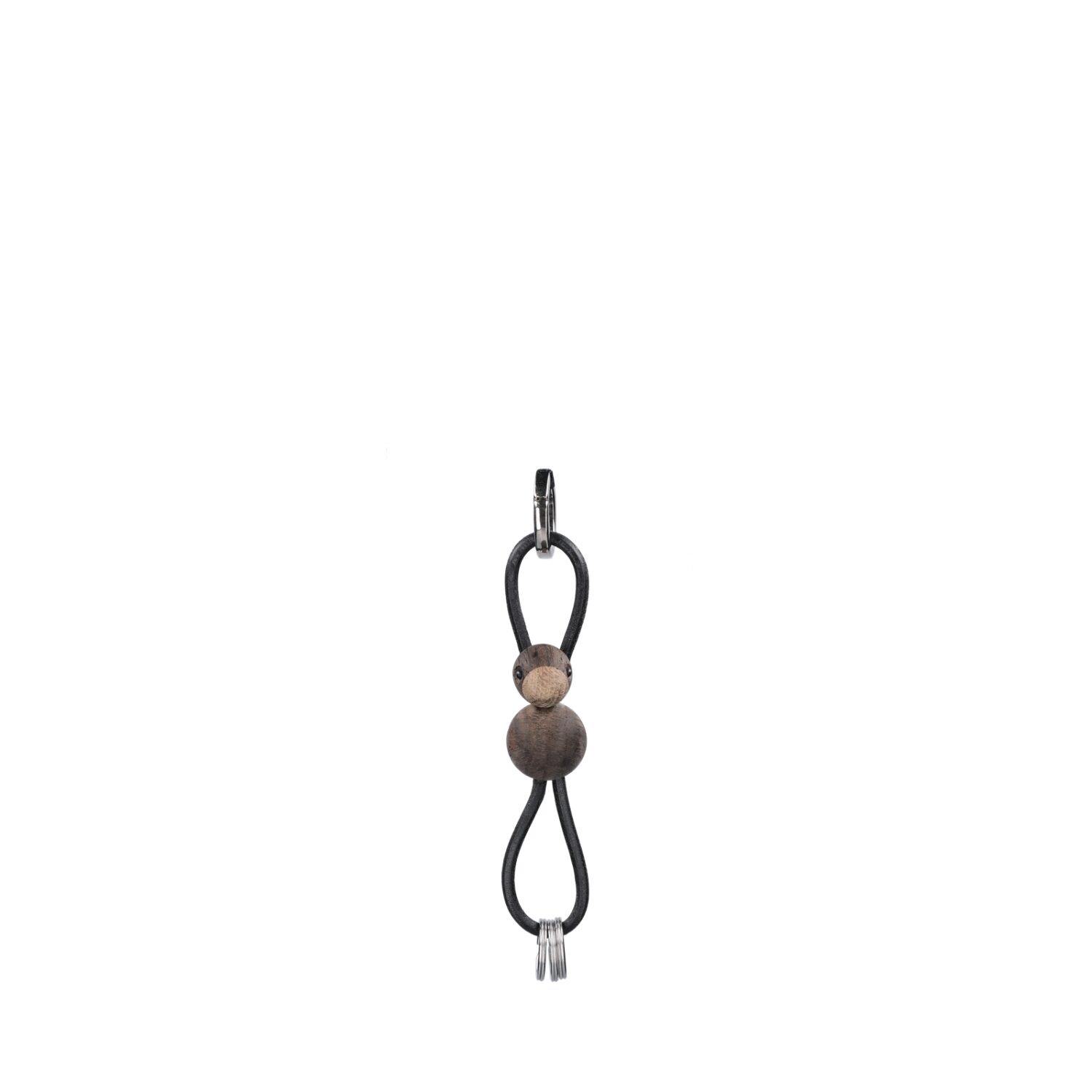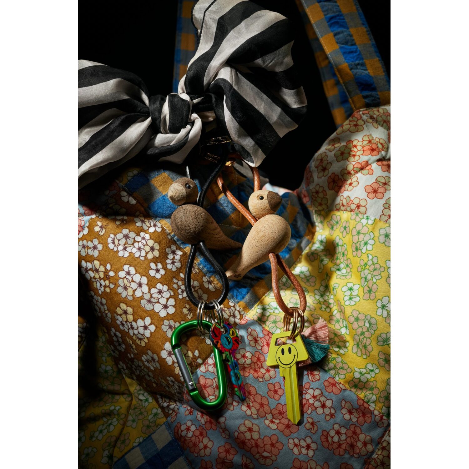 Llavero Pájaro Kay Bojesen en metal plata con piel negra. Figura en madera de roble ahumado FSC®, diseño danés funcional y elegante con carácter icónico.