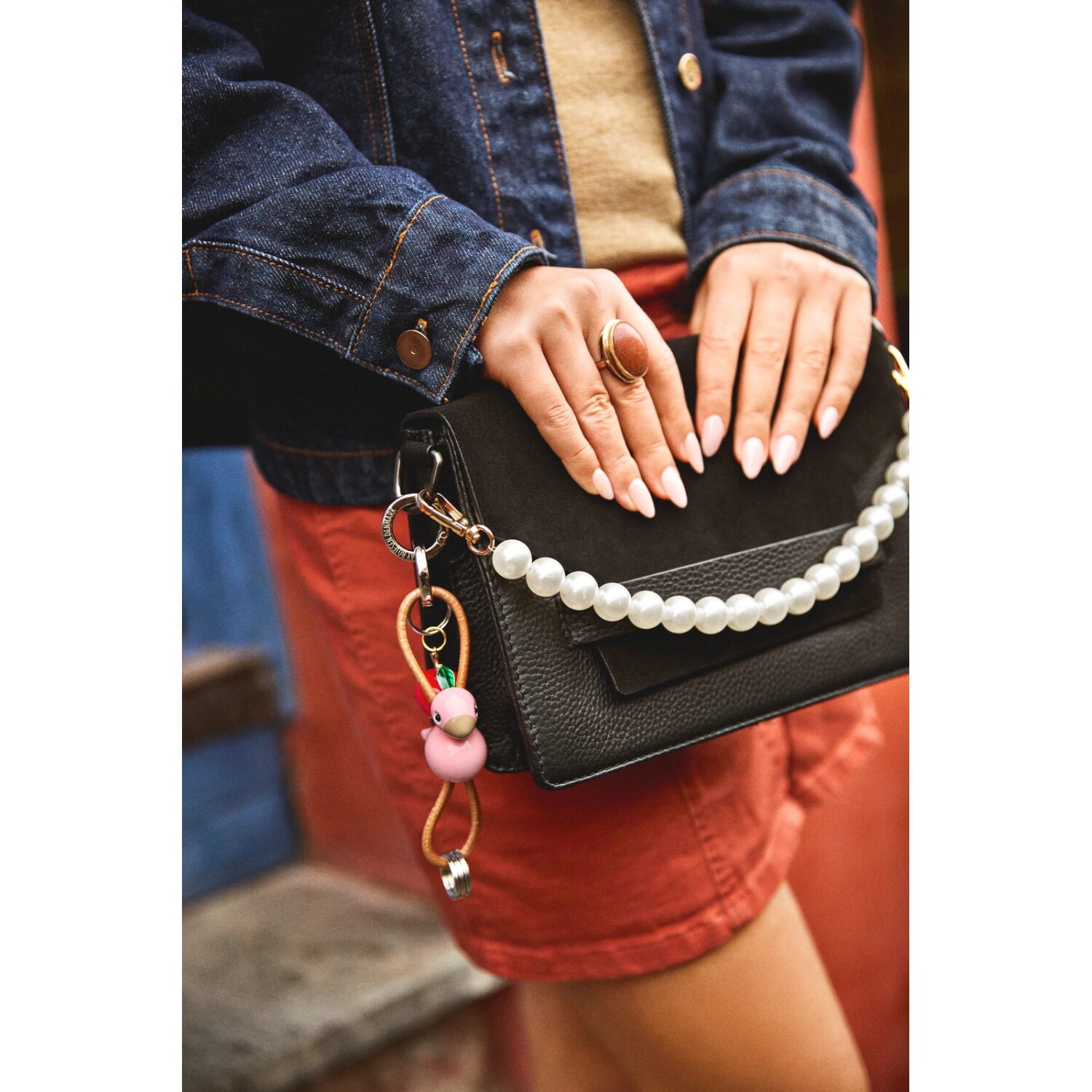 El diseño se completa con un cordón de cuero natural auténtico, ajustable, que permite regular la posición de la figura y personalizar su aspecto según el uso. Este detalle aporta flexibilidad, funcionalidad y un contraste material sutil entre la calidez de la madera y la textura del cuero. En la parte superior, un anillo metálico plateado con mosquetón integrado, grabado con el nombre Kay Bojesen Denmark, cumple una doble función: elemento estético y sistema práctico de apertura y cierre.