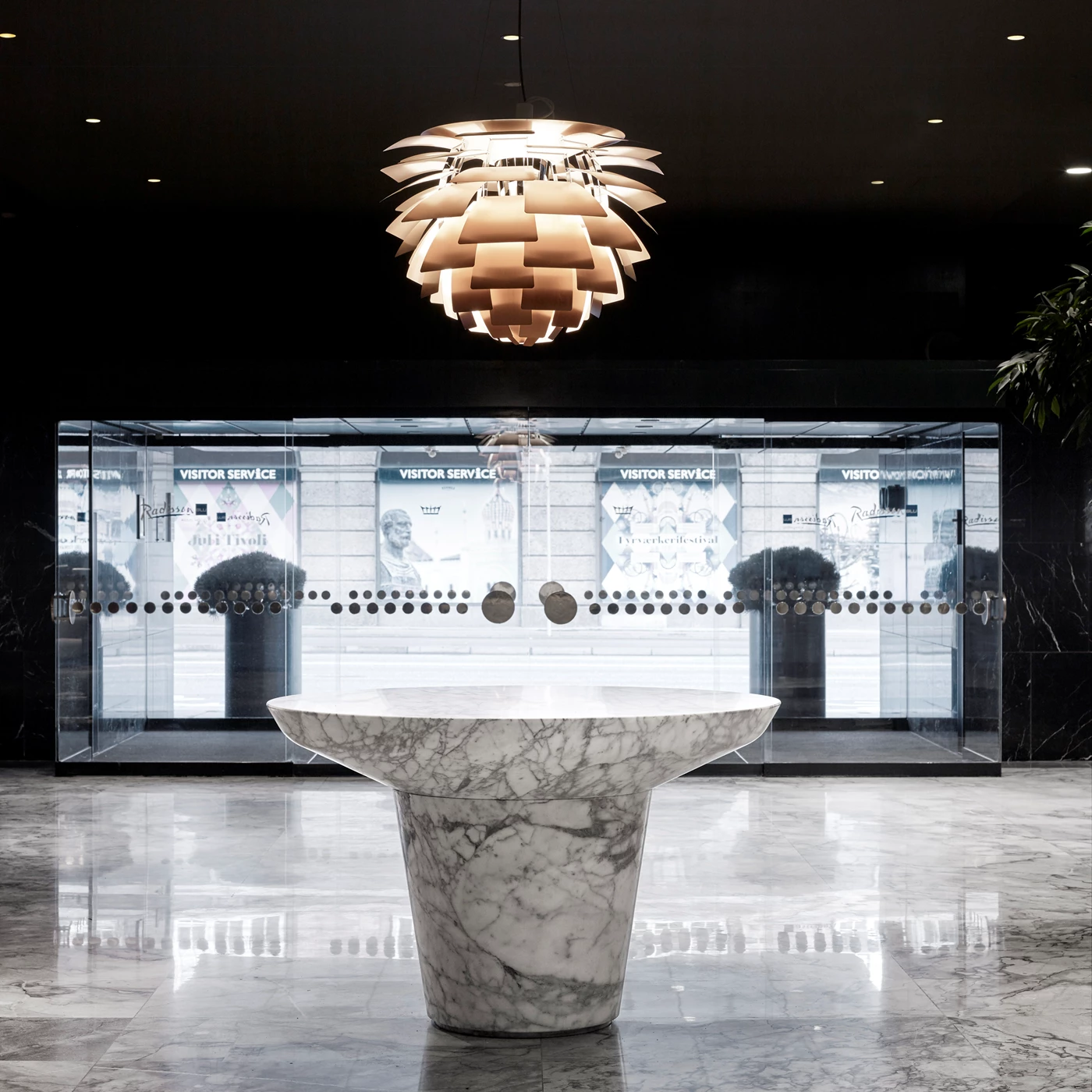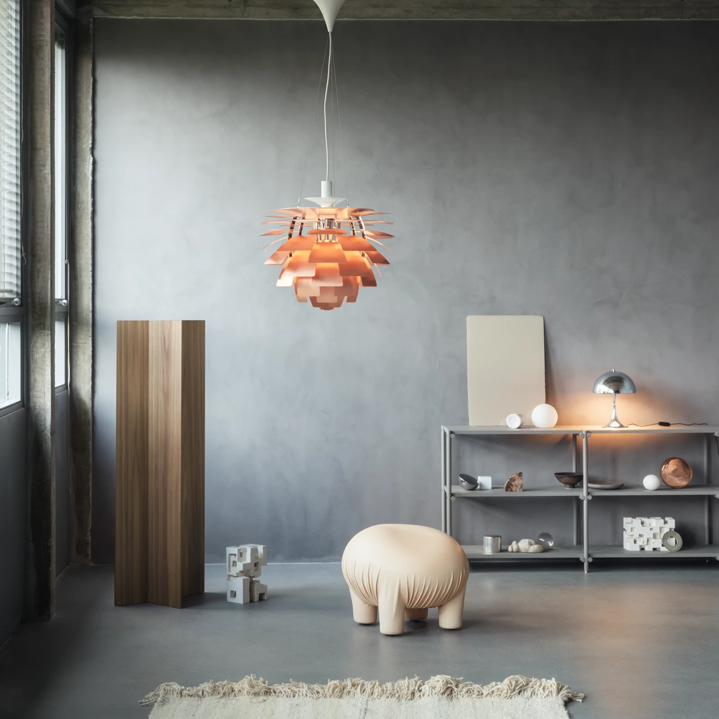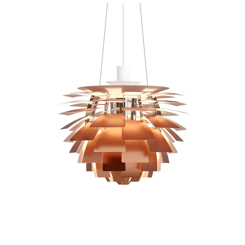 La PH Artichoke de Louis Poulsen es un icono del diseño danés, creado en 1958 por Poul Henningsen para el restaurante Langelinie Pavillonen en Copenhague. Con sus 72 hojas metálicas dispuestas en 12 hileras, distribuye la luz de manera uniforme y sin deslumbramiento, ofreciendo una iluminación cálida y envolvente desde cualquier ángulo.