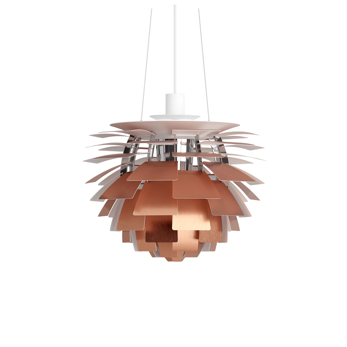Lámpara PH Artichoke Ø480 Copper de Louis Poulsen. Diseño de Poul Henningsen en cobre cepillado, con 72 hojas metálicas ensambladas a mano y fuente LED de alta eficiencia.