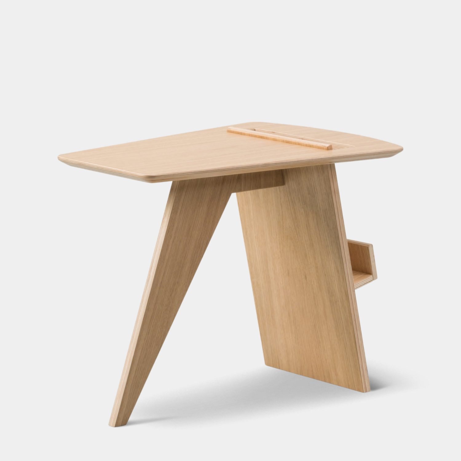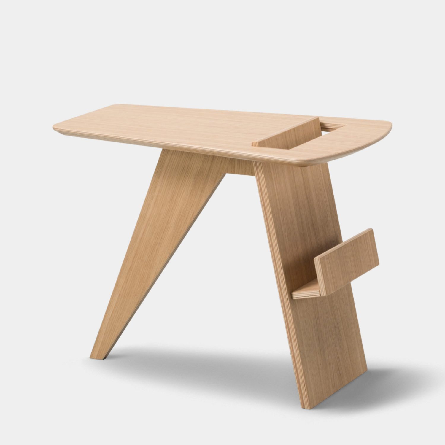 Fabricada en contrachapado de roble lacado, su estructura de tres patas ofrece estabilidad y ligereza visual, mientras que su acabado en laca de alta calidad, más delicado que el barniz tradicional, desarrolla con el tiempo una pátina natural y sofisticada que resalta la belleza intrínseca de la madera.