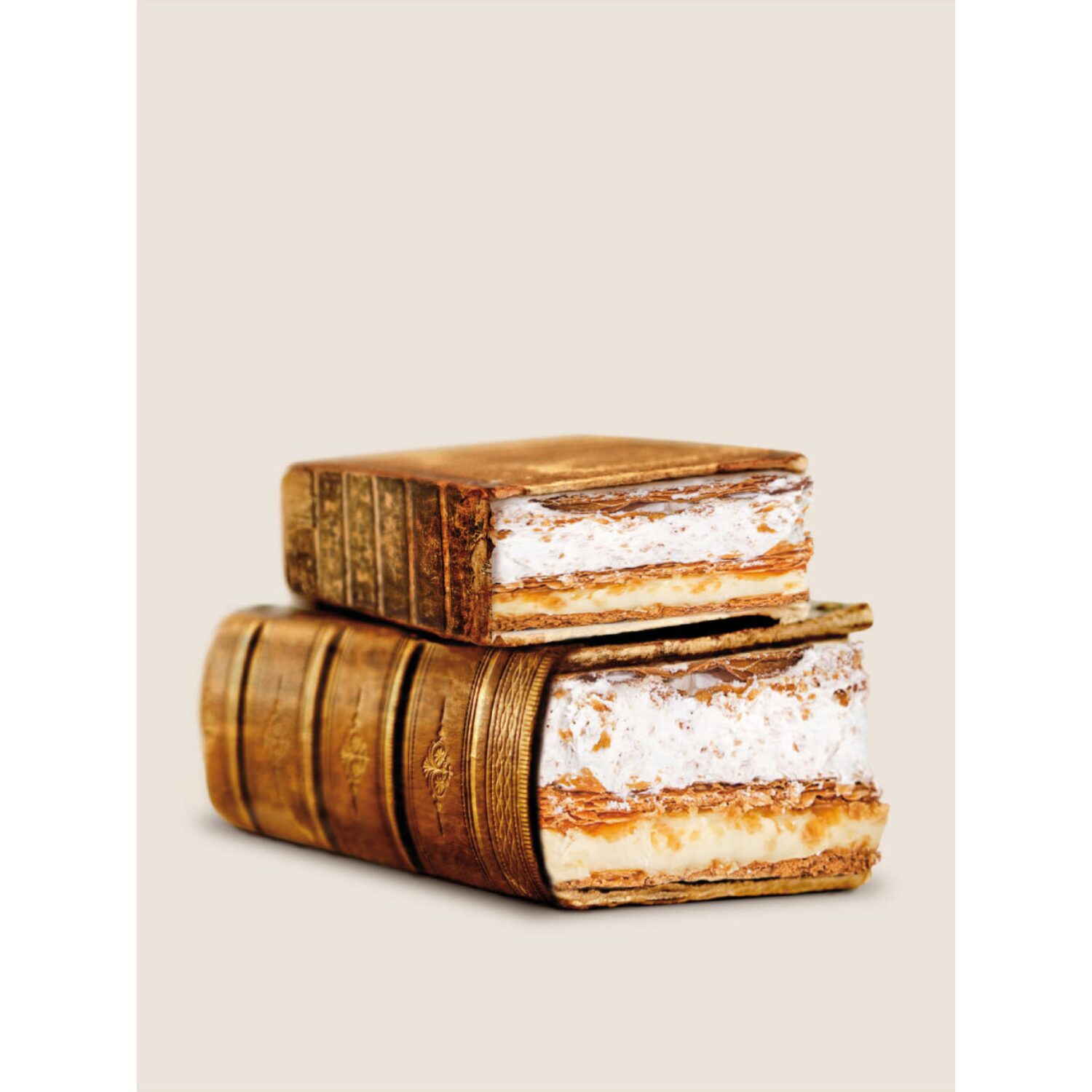 Mediante collage e impresión digital, JeJe construye una imagen tan humorística como elocuente: un pastel milhojas formado por libros antiguos, donde la cultura y el placer se funden en una deliciosa ironía visual.