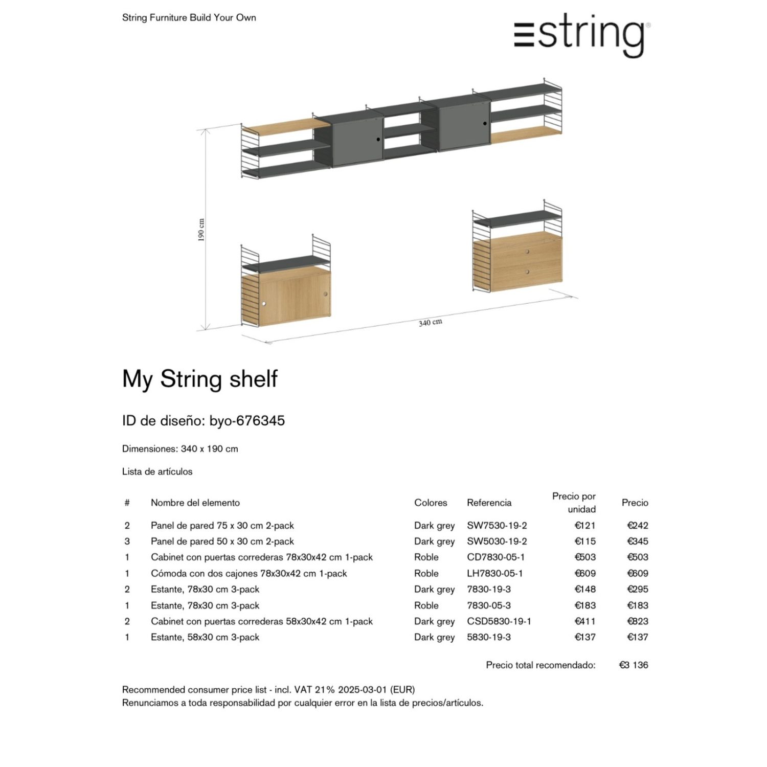 My String Shelf Dark Grey & Oak de String Furniture, diseño de Nisse y Kajsa Strinning. Composición modular de 340 × 190 cm, con estructura metálica en Dark Grey y módulos en roble natural, fabricada en Suecia.