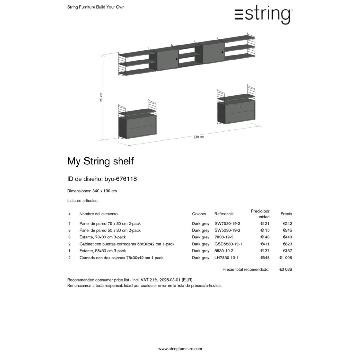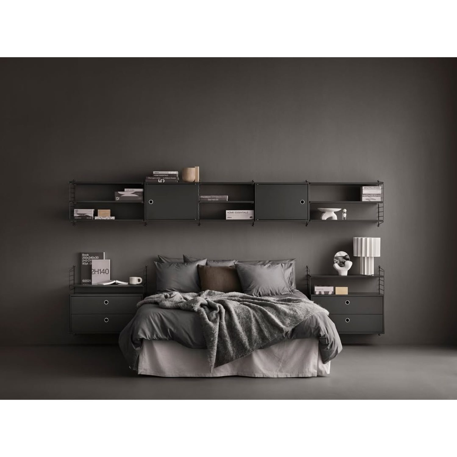 My String Shelf Dark Grey de String Furniture, diseño de Nisse y Kajsa Strinning. Composición modular de 340 × 190 cm en acero lacado gris oscuro, fabricada en Suecia. Diseñado por Kajsa y Nisse Strinning en 1949, este icono del diseño no solo se considera una invención magistral, sino que está oficialmente reconocido como una obra de arte.