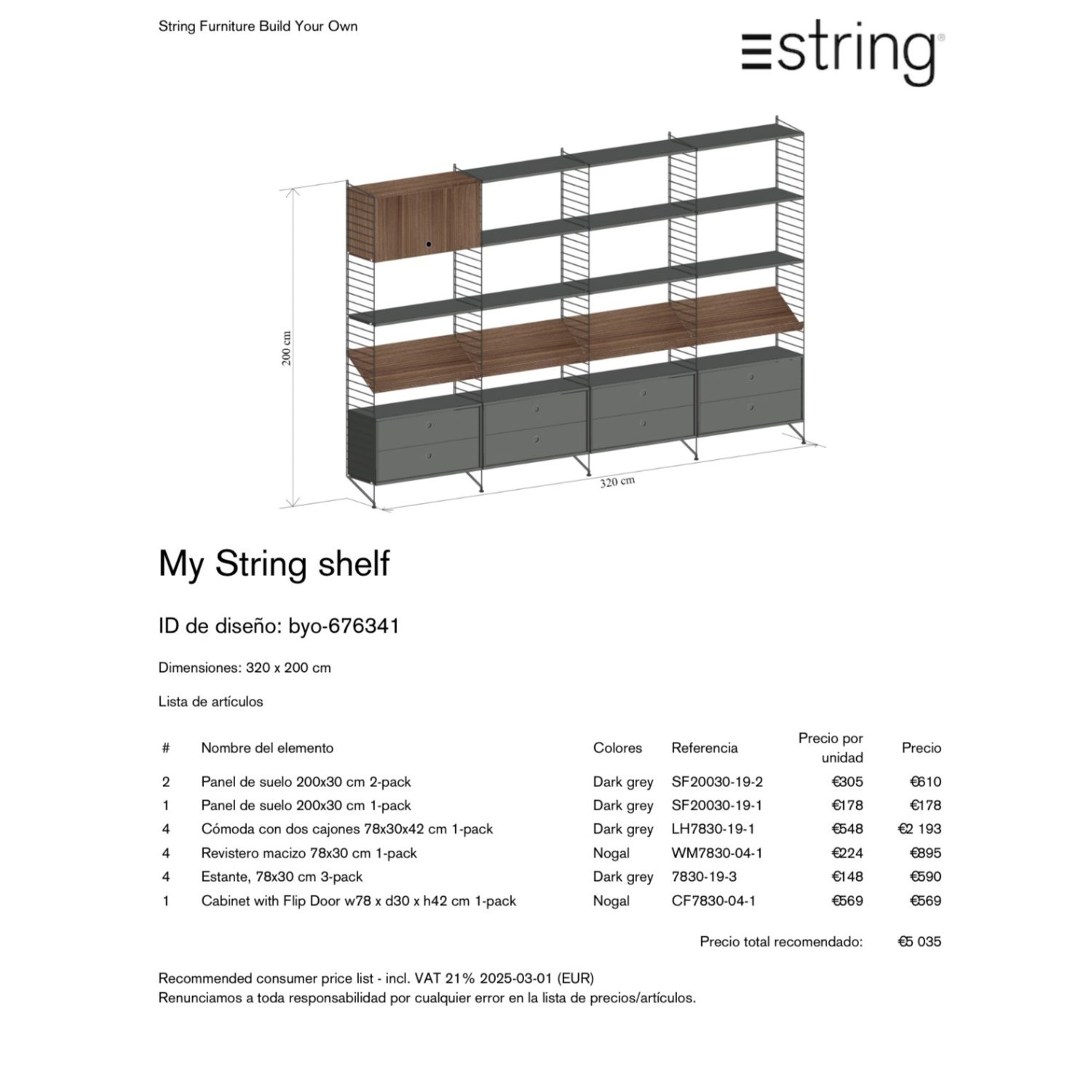 My String Shelf Dark Grey & Walnut de String Furniture, diseño de Nisse y Kajsa Strinning. Composición modular de 320 × 200 cm, con estructura metálica en Dark Grey y detalles en nogal natural, fabricada en Suecia.