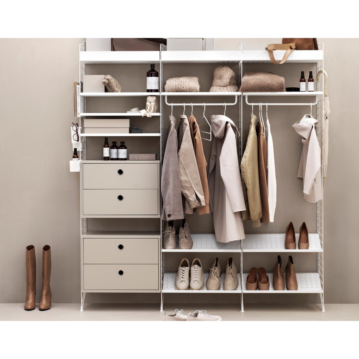 My String Wardrobe White & Beige de String Furniture, diseño de Nisse y Kajsa Strinning. Composición modular de 180 × 200 cm con estructura blanca, cómodas beige y barras metálicas para colgar, fabricada en Suecia.