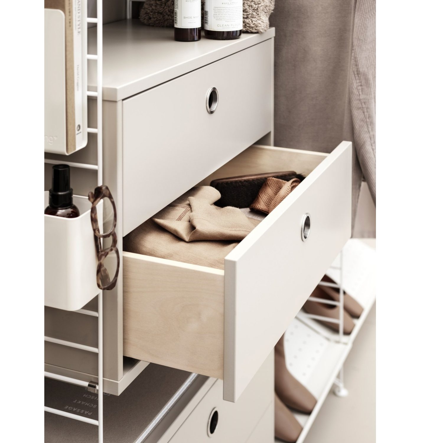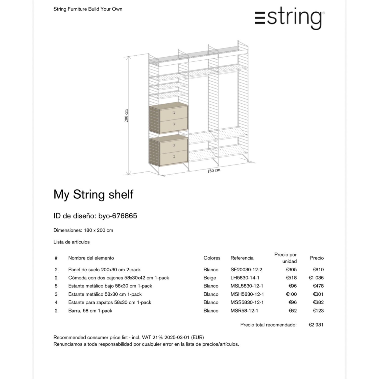 La composición de 180 × 200 cm ofrece una solución de almacenaje versátil con paneles blancos, cómodas en beige y barras metálicas para colgar, creando un equilibrio visual suave y ordenado. Su estructura abierta mantiene la ligereza característica del sistema String, adaptándose perfectamente a dormitorios o vestidores contemporáneos.