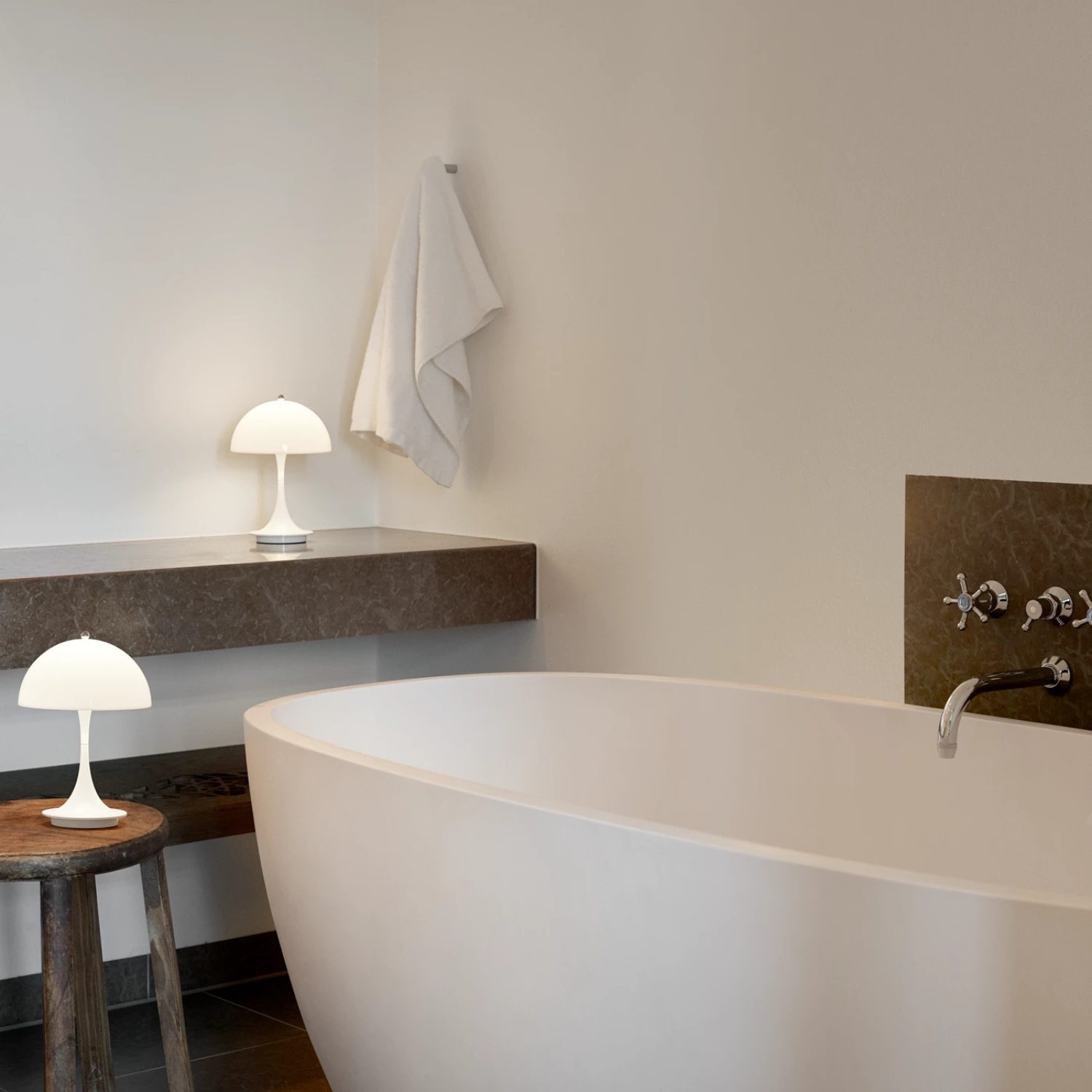 Panthella 160 Portable Opal White: diseño icónico de Verner Panton en formato compacto, portátil y regulable, con luz ambiental cálida y difusa.