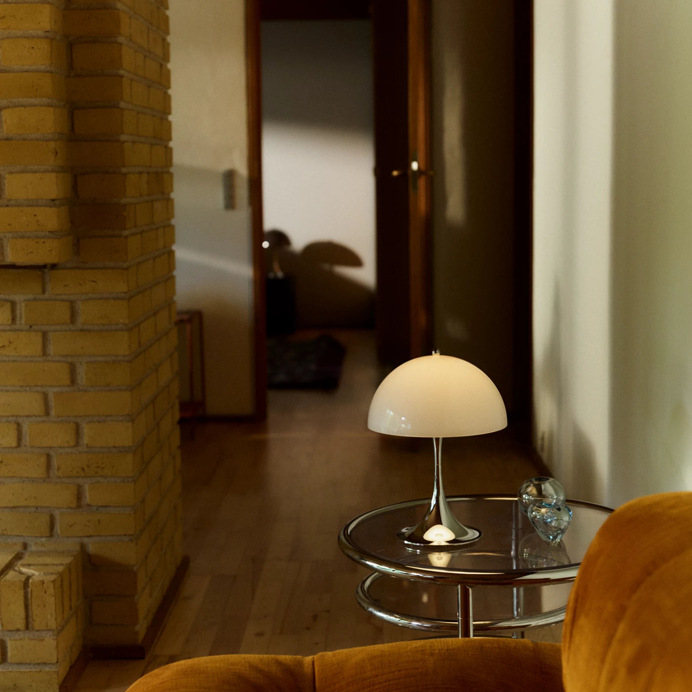 La Panthella 250 Portátil Chrome Opal Blue Grey – The Originals emite una luz suave, cálida y confortable, pensada para iluminación ambiental.