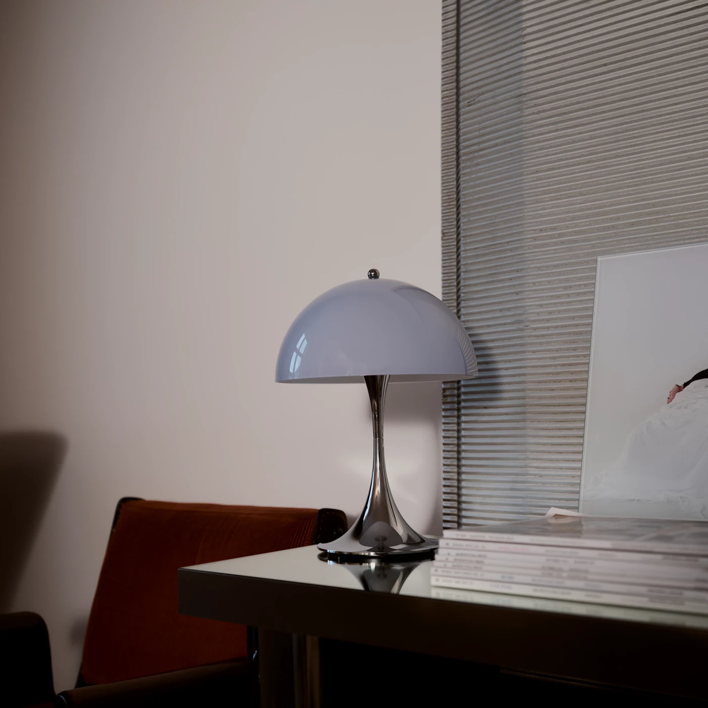El acabado chrome opal blue grey introduce una lectura más sobria y contemporánea del lenguaje cromático de la Panthella, combinando una pantalla opal de tono suave con una base cromada que refuerza su carácter escultórico sin alterar la percepción de la luz.