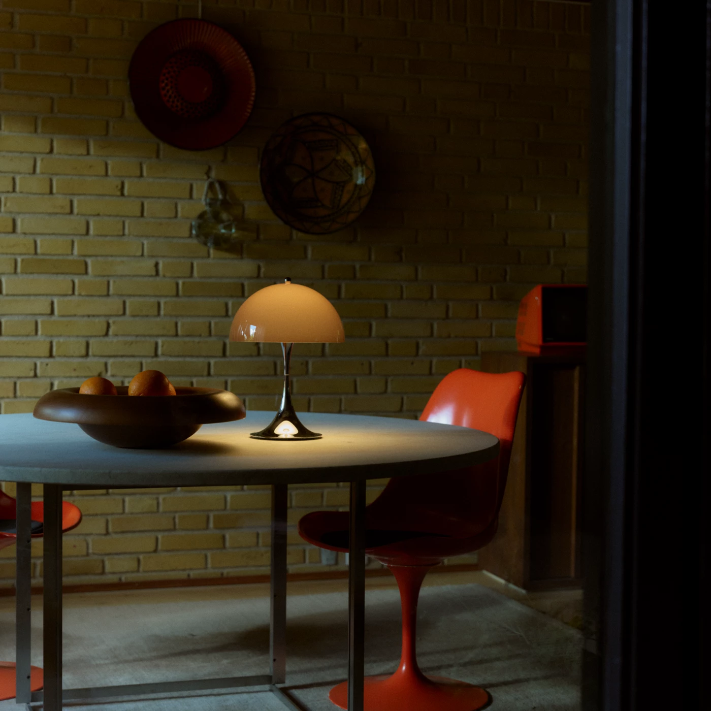 Lámpara portátil con pantalla opal que emite una luz cálida y uniforme, basada en el lenguaje cromático de la Panthella de 1971.