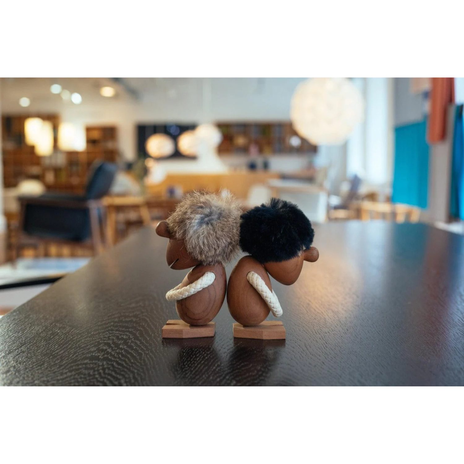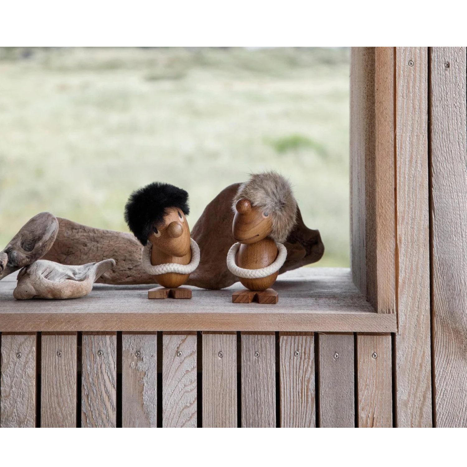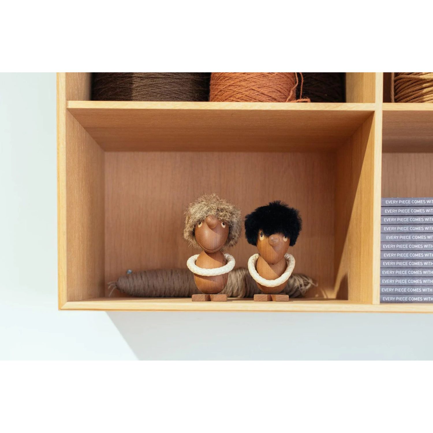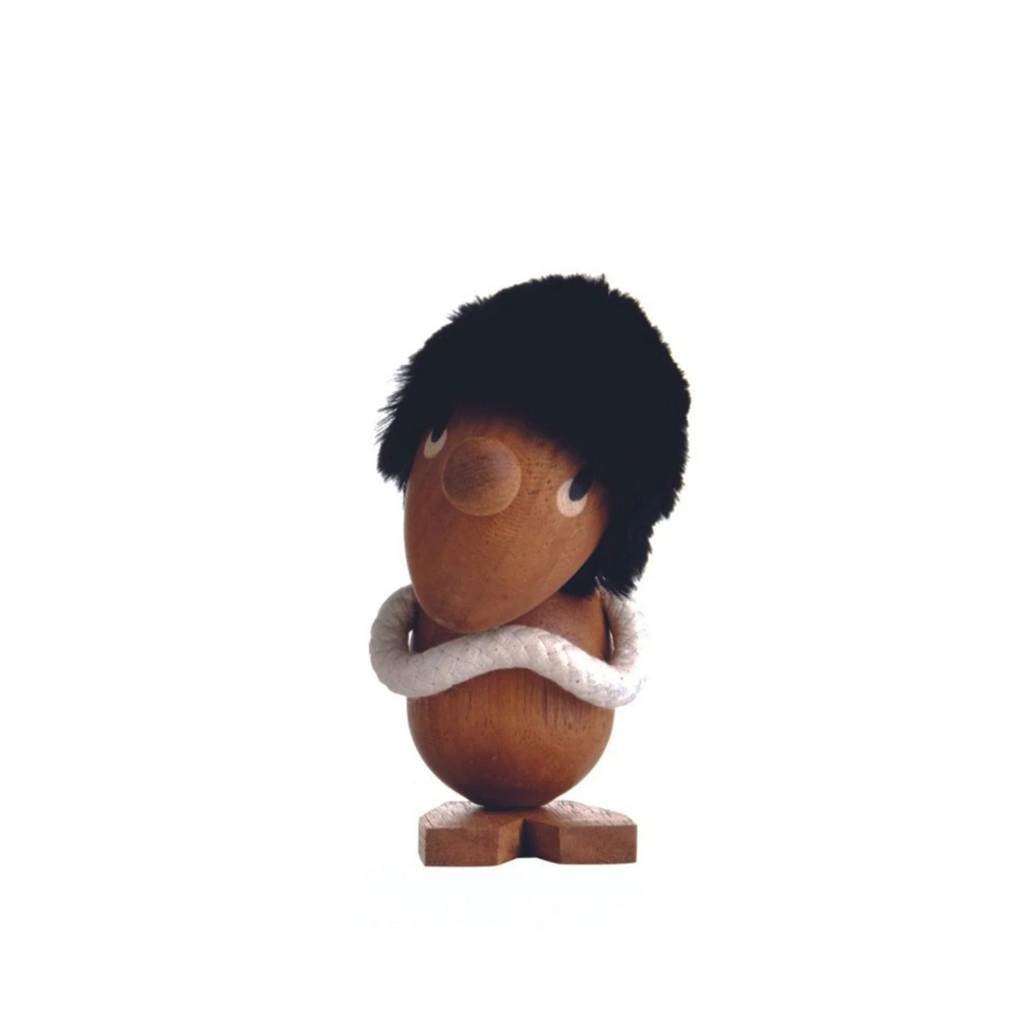 Pessimist de Hans Bølling (11,5 cm), fabricado en teca con cabello de fibras sintéticas y brazos de cuerda. Una figura icónica que refleja el lado reflexivo del ser humano.
