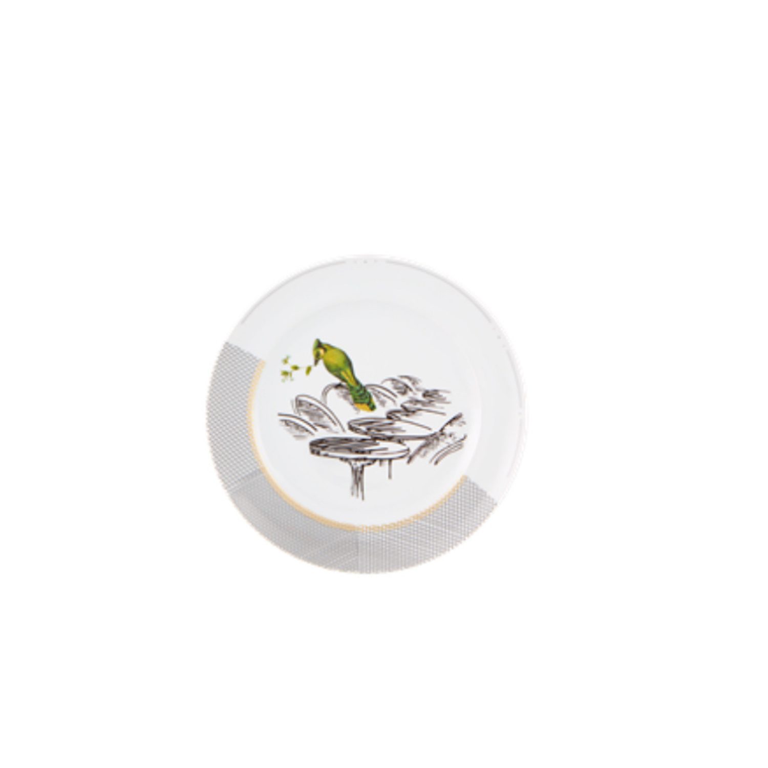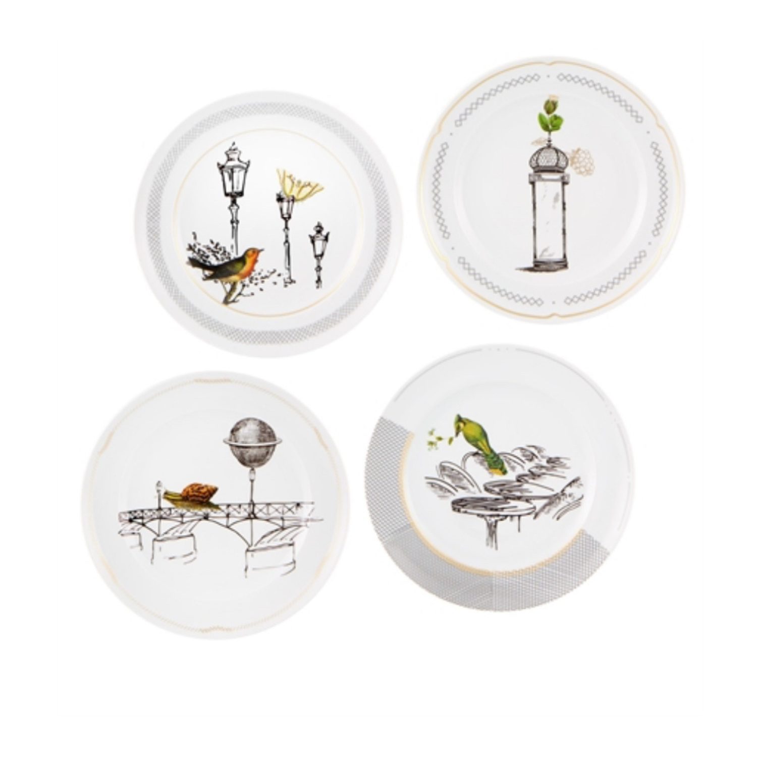 Juego de 4 platos de postre Vista Alegre Petites Histoires en porcelana. Diseño contemporáneo de Sam Baron con ilustraciones poéticas y detalles en oro.